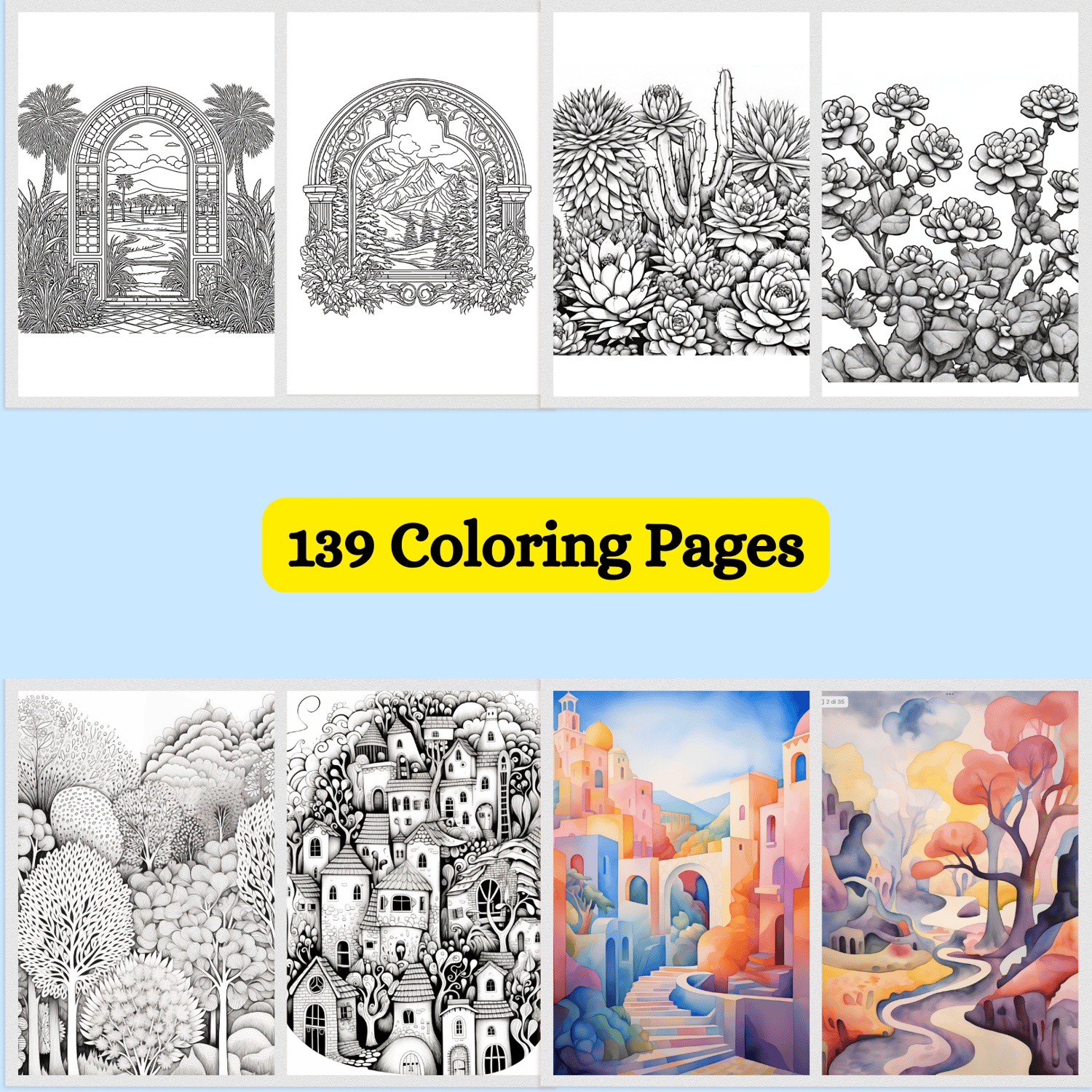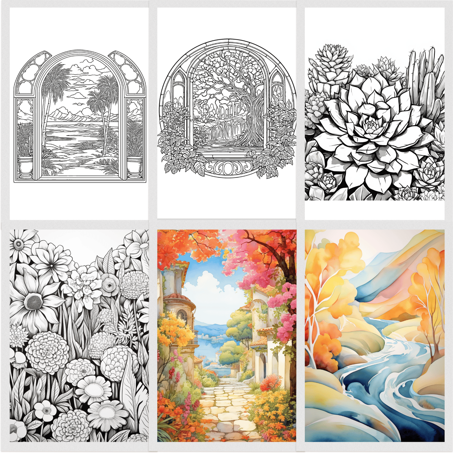 From picturesque views seen through windows to serene desert landscapes, abstract art interpretations, and scenes of mountains, forests, flowers and villages, this bundle ensures a rich coloring experience.