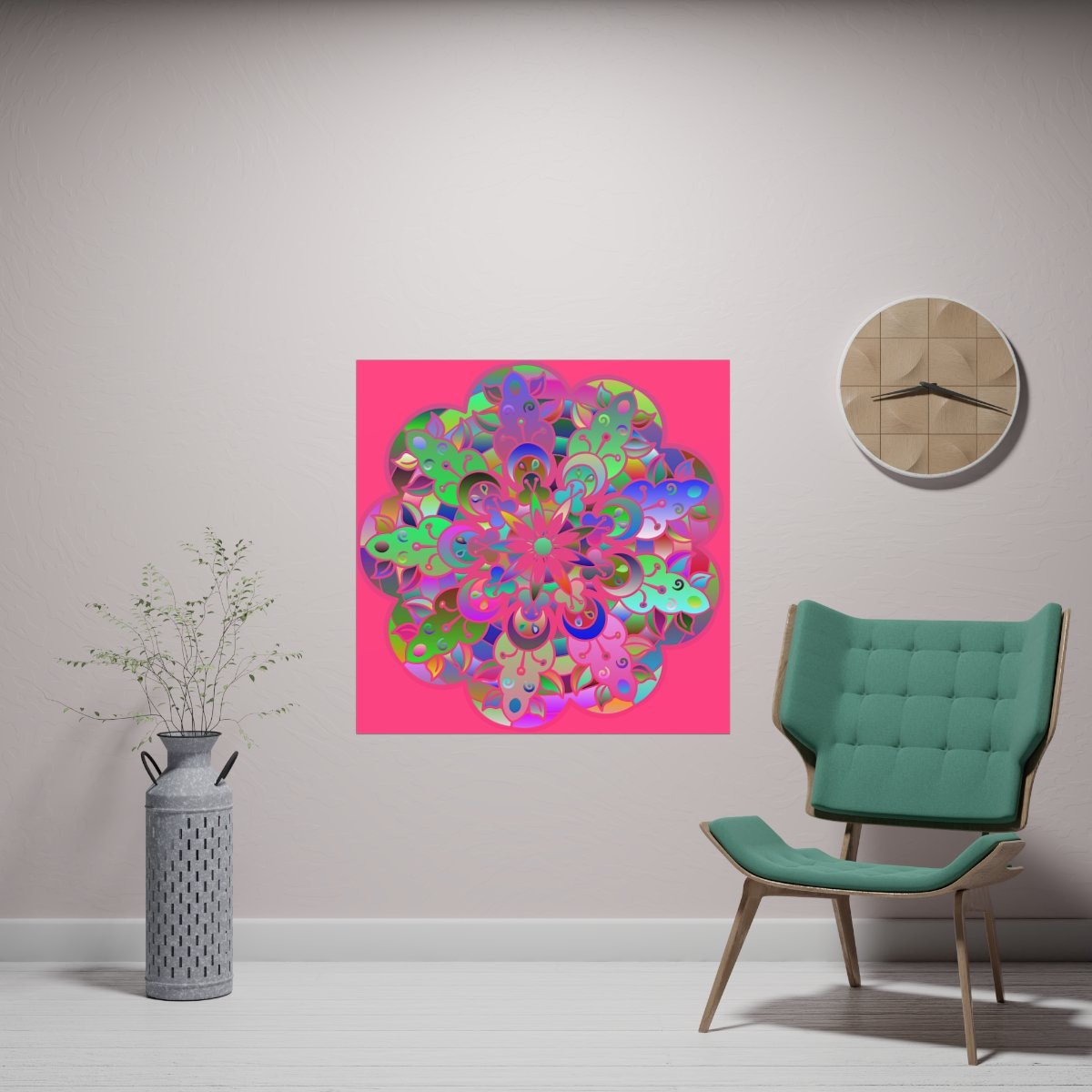 Transform any space with the vibrant allure of custom artwork. This square poster, adorned with super bright, hand-drawn mandala art, is designed to elevate any room with its vivid colors and intricate details.
