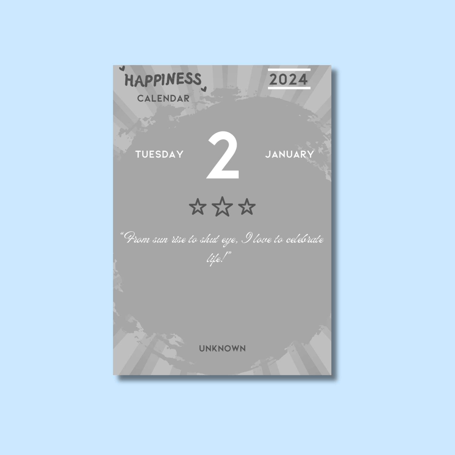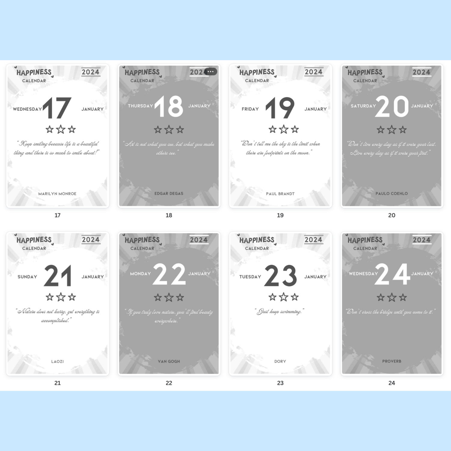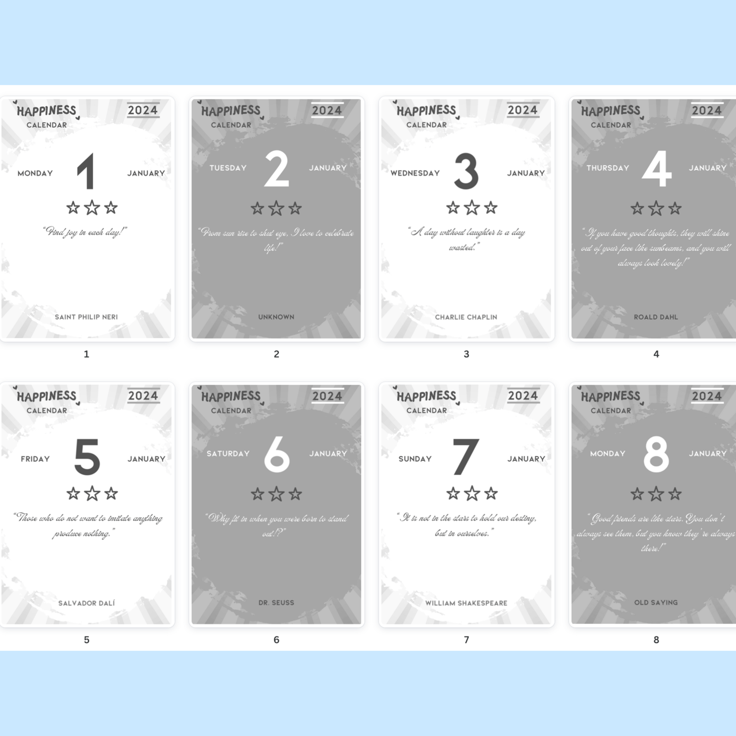 Discover daily doses of joy with Happiness Calendar 2024. Each day features a unique inspirational sentence paired with its author, carefully curated to uplift and motivate. Formatted with alternating white (for even days) and grey (for odd days) palettes, this calendar is a visual delight. Print in 3.9 x 5.5 inches format with your favourite printer provider and enjoy a small book of happiness with strippable pages.