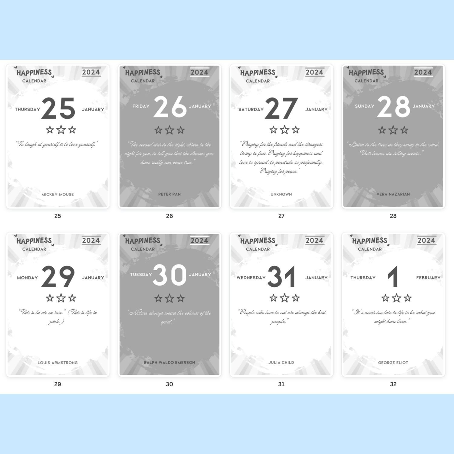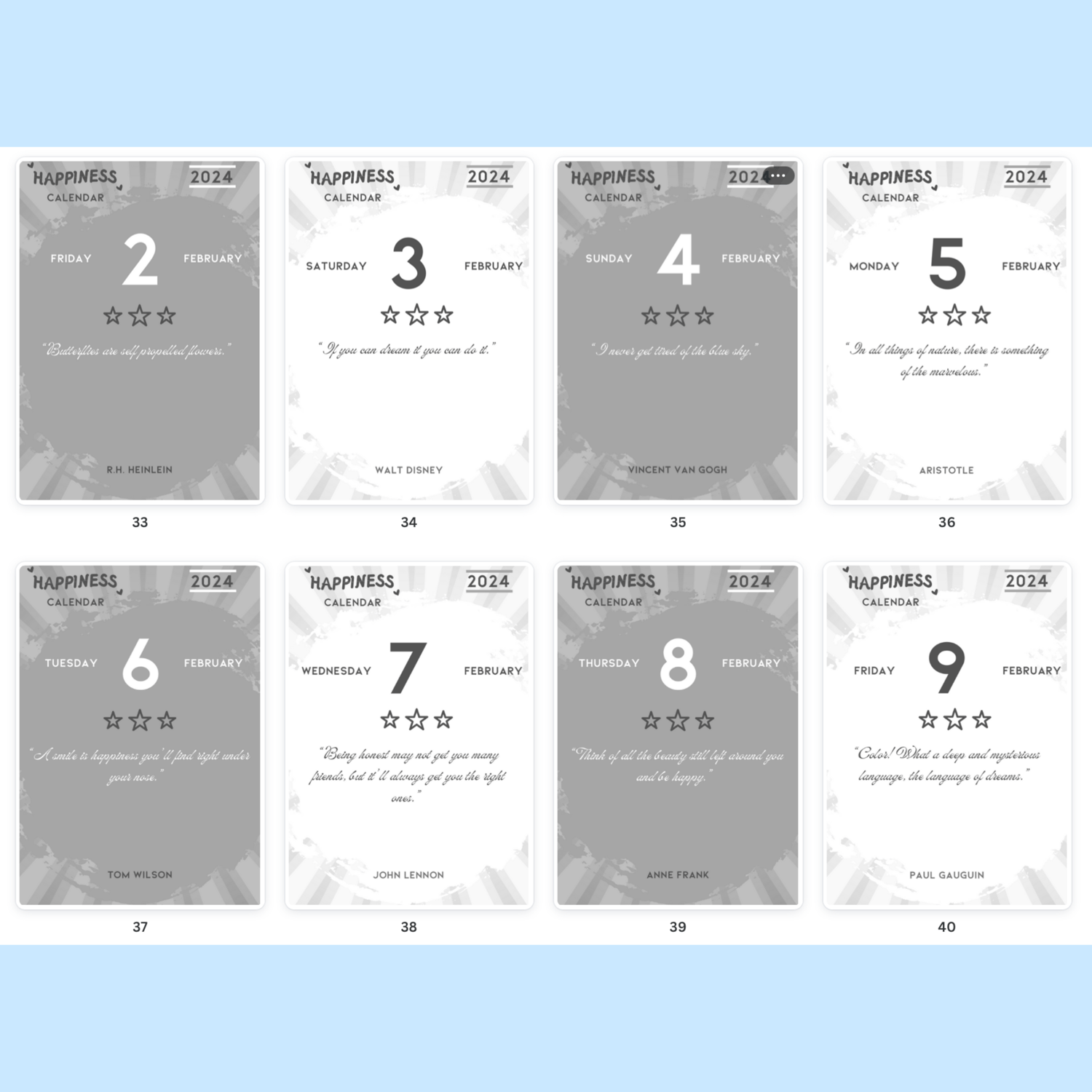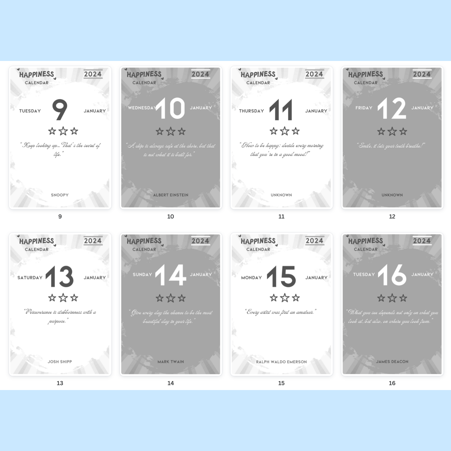 Discover daily doses of joy with Happiness Calendar 2024. Each day features a unique inspirational sentence paired with its author, carefully curated to uplift and motivate. Formatted with alternating white (for even days) and grey (for odd days) palettes, this calendar is a visual delight. Print in 3.9 x 5.5 inches format with your favourite printer provider and enjoy a small book of happiness with strippable pages.