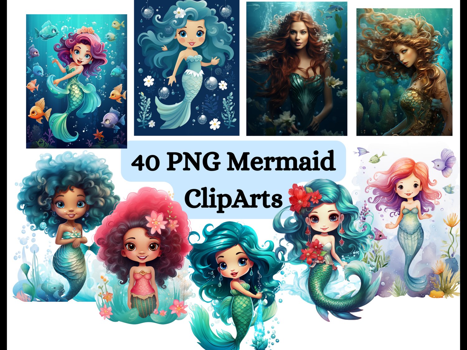 40 PNG Mermaid Clipart Bundle: Watercolor Mermaid, Hyperrealistic Mermaid, Little Mermaid png, Afro Mermaid, Siren Clipart