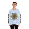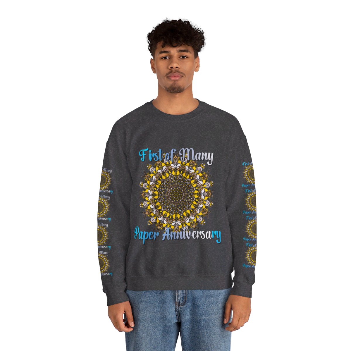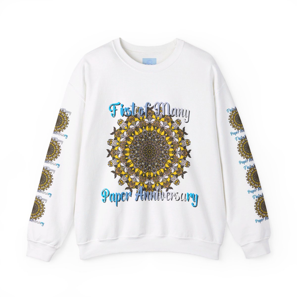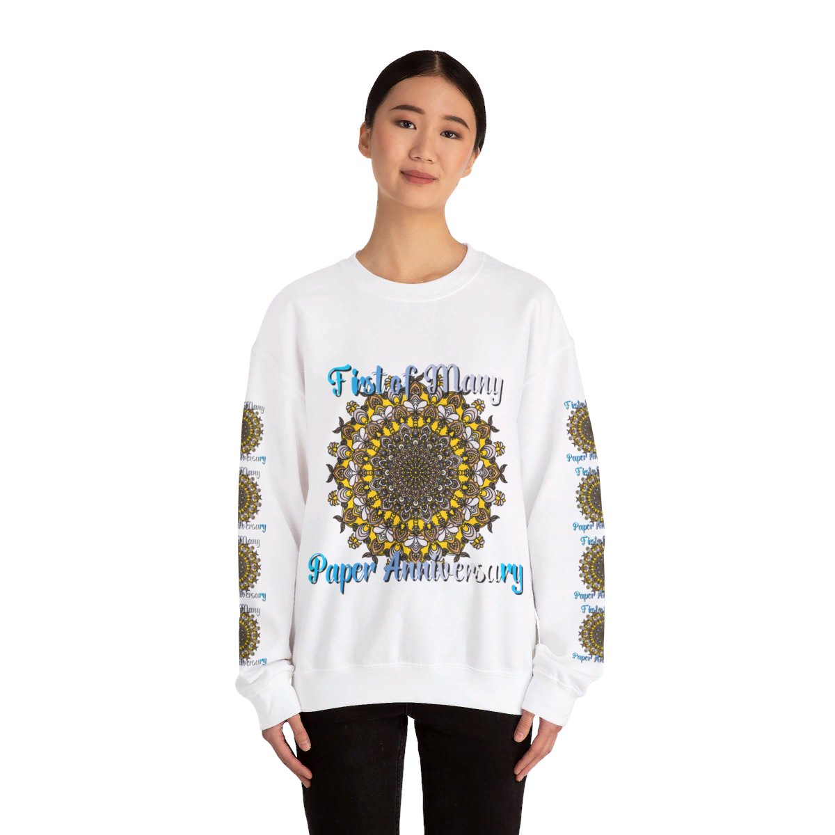 Celebrate your first year of marriage with the cozy and stylish "First of Many, Paper Anniversary" Unisex Heavy Blend™ Crewneck Sweatshirt from Blululi. Featuring a beautiful hand-drawn mandala design in shades of gold and white, this sweatshirt is the perfect way to mark your first wedding anniversary with warmth and love.