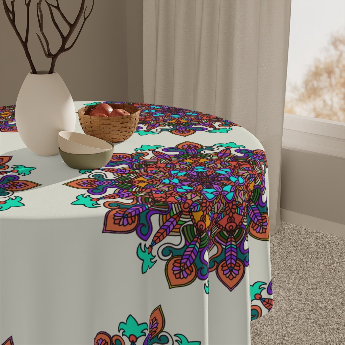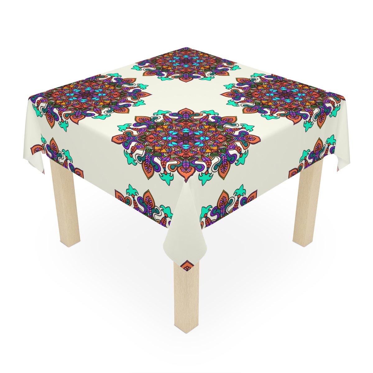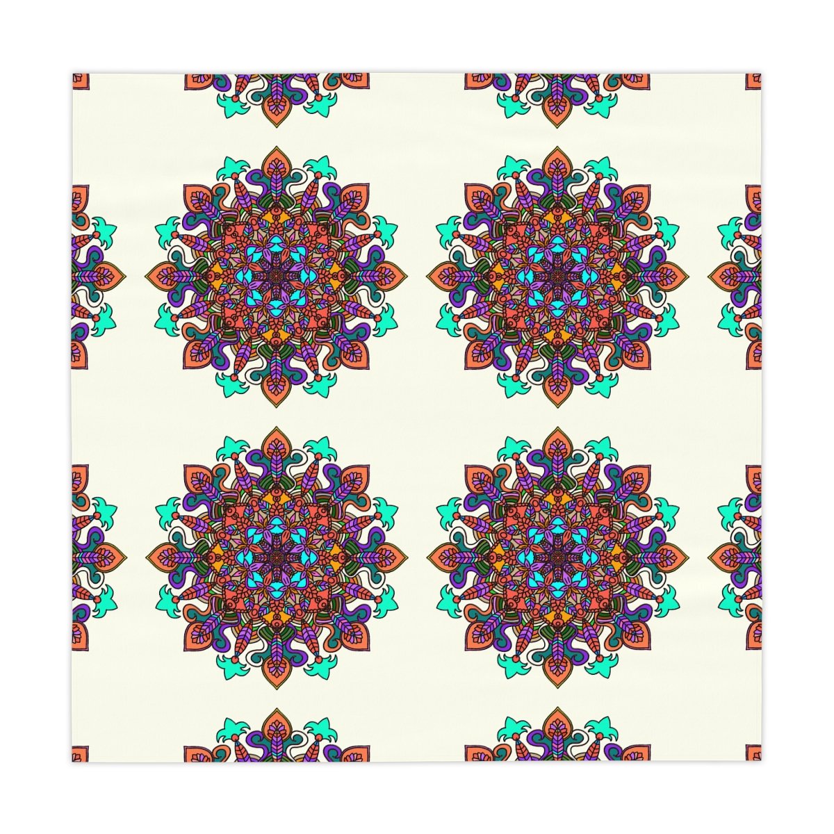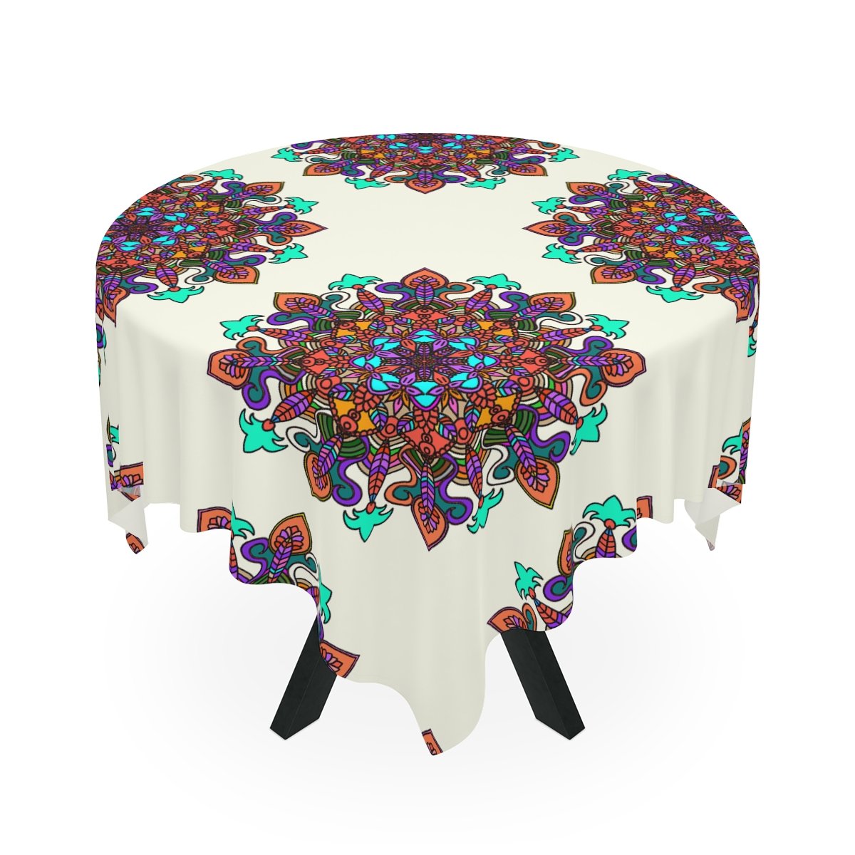 Uplift any home's aesthetics with this personalized tablecloth. Each Mandala Art is Drawn by Hand. Measuring in at 55.1" by 55.1", this personalized table cloth is a full-print product. What's more, the 100% polyester fabric construction makes it effortless to maintain like new.