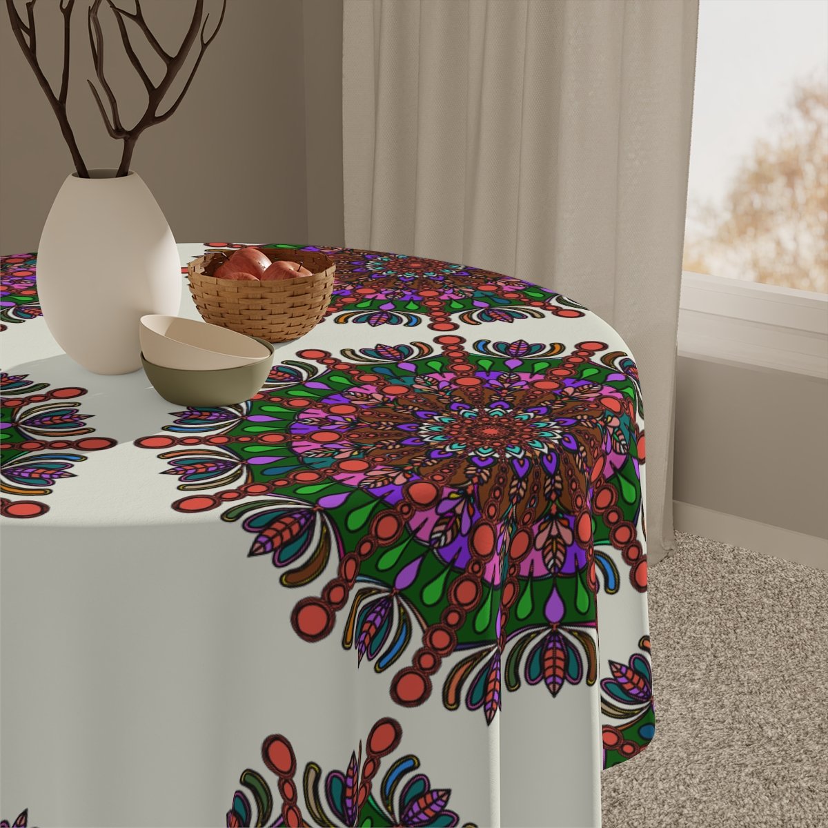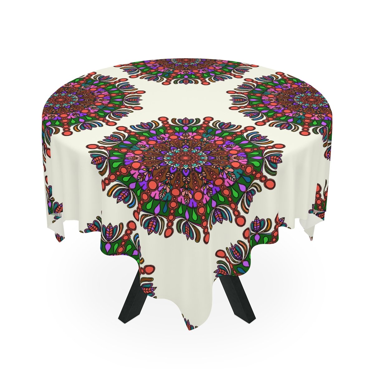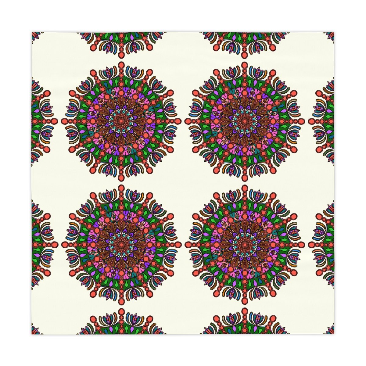 Uplift any home's aesthetics with this personalized tablecloth. Each Mandala Art is Drawn by Hand. Measuring in at 55.1" by 55.1", this personalized table cloth is a full-print product. What's more, the 100% polyester fabric construction makes it effortless to maintain like new.