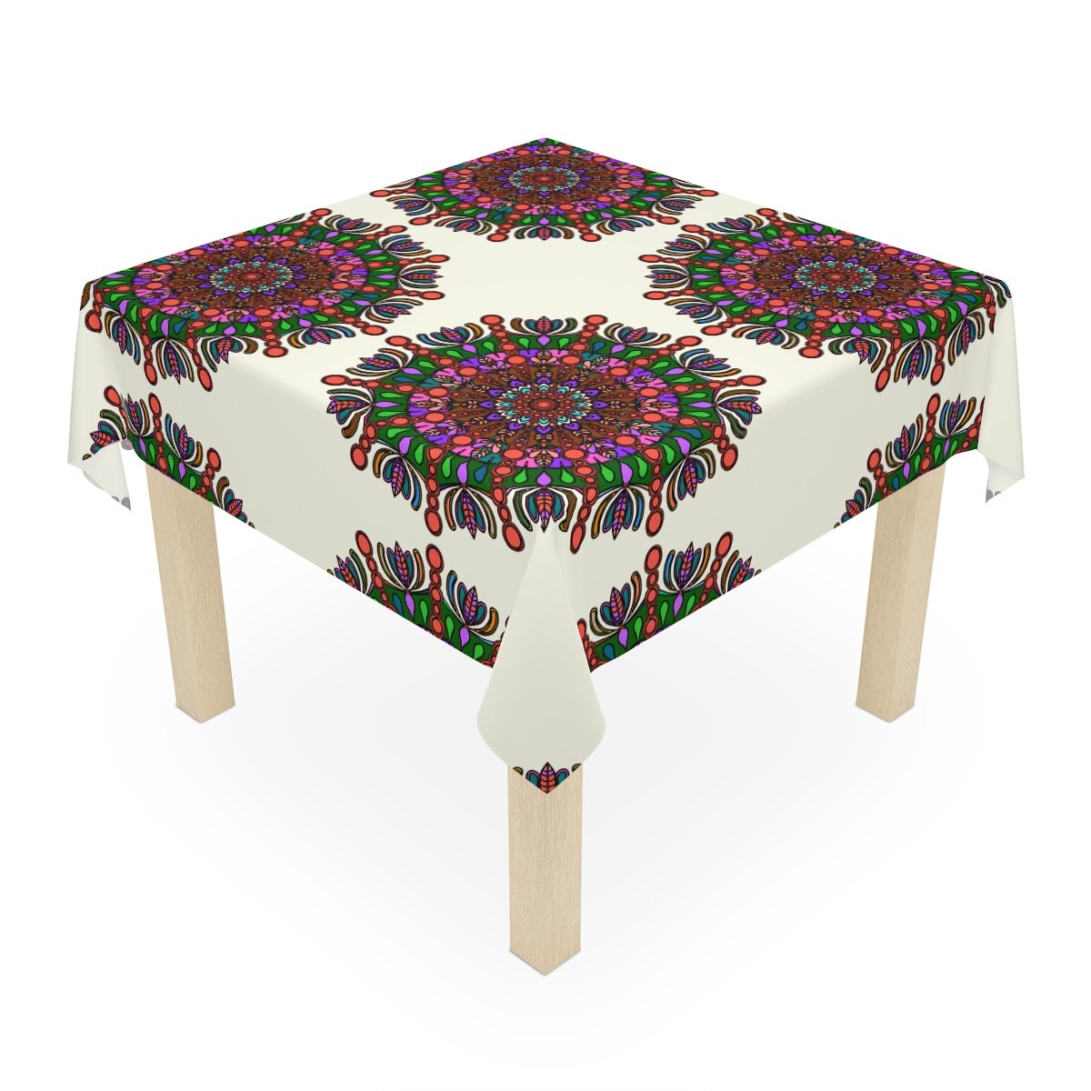 Tablecloth with Mandala Art Drawn by Hand, Ivory, Square
