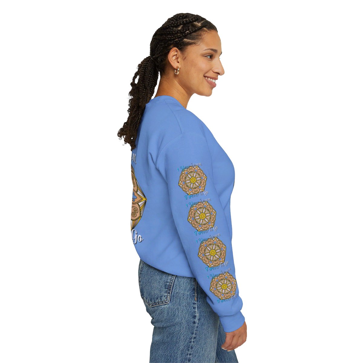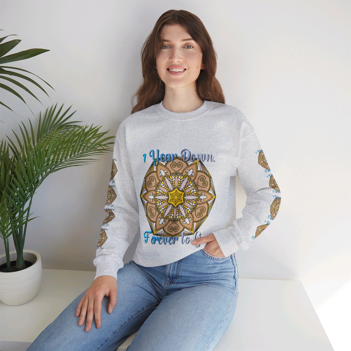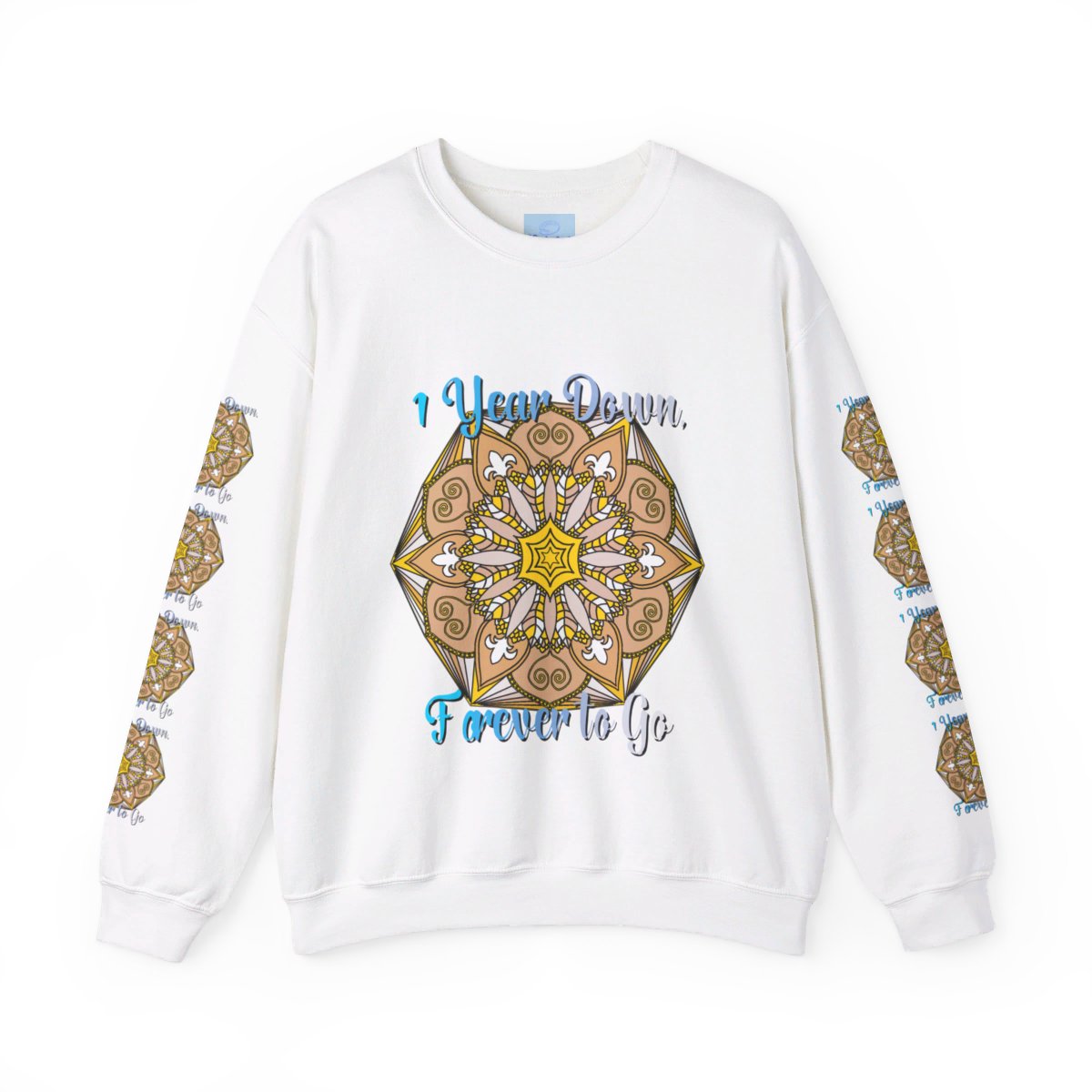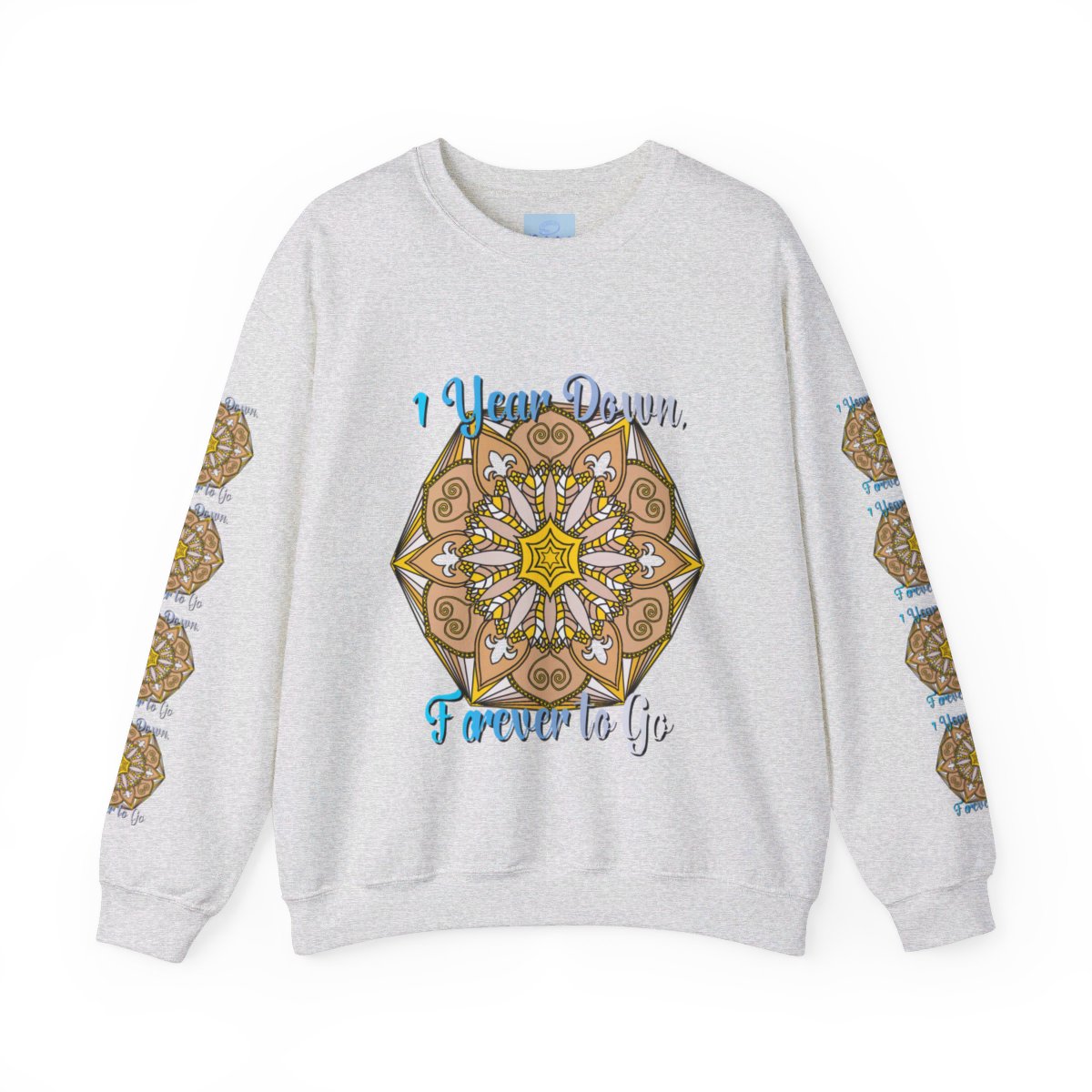 Celebrate your first year of marriage with the cozy and stylish "1 Year Down, Forever to Go" Unisex Heavy Blend™ Crewneck Sweatshirt from Blululi. Featuring a beautiful hand-drawn mandala design in shades of gold and white, this sweatshirt is the perfect way to mark your first wedding anniversary with warmth and love.