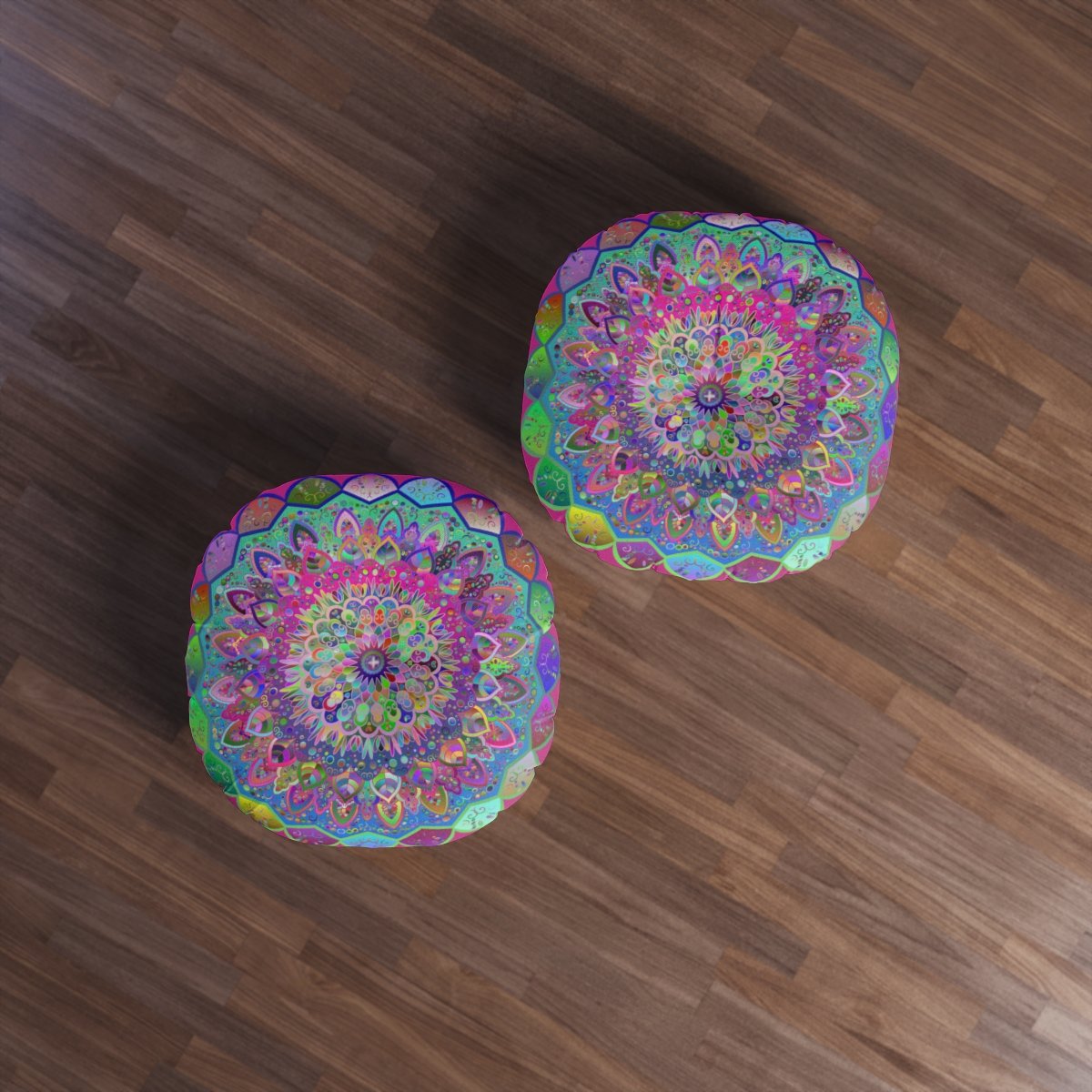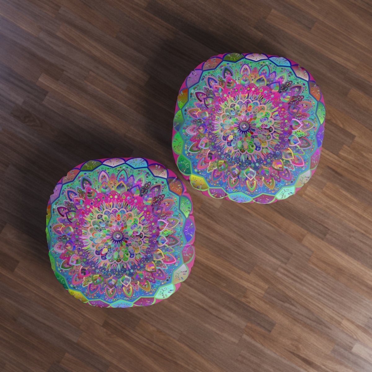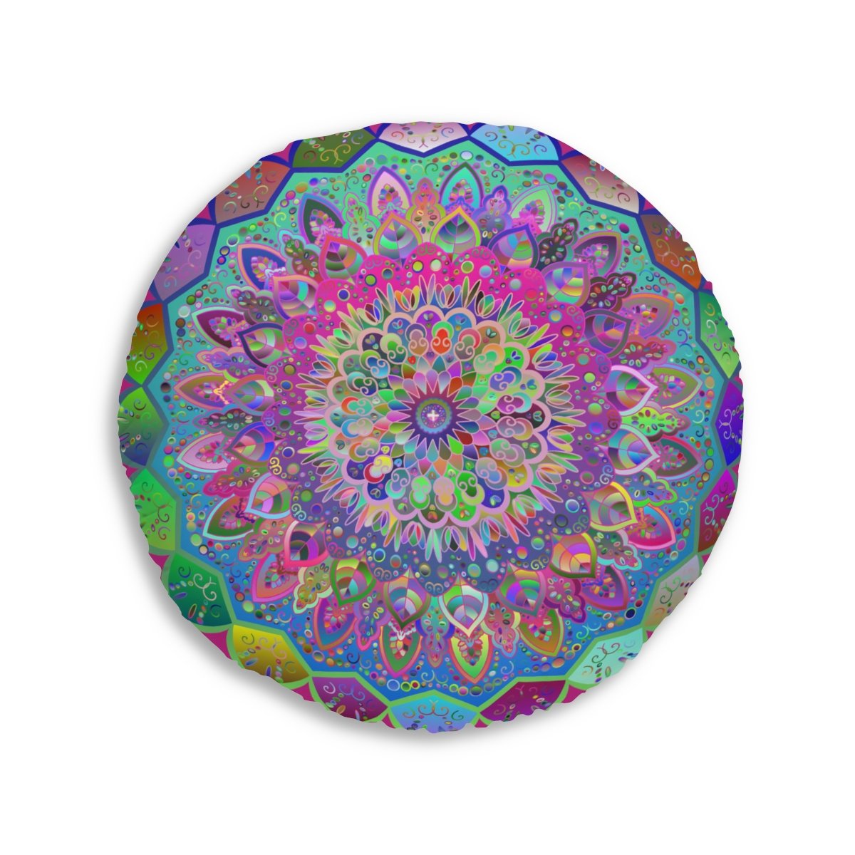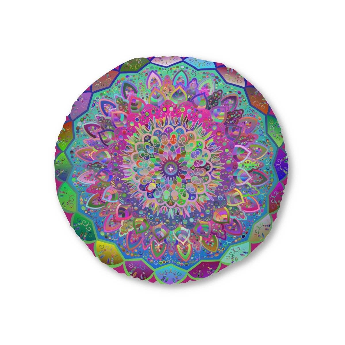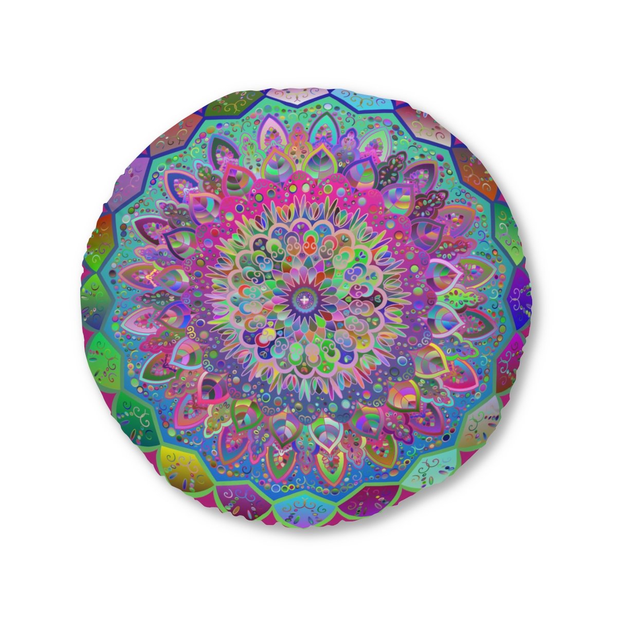 Add a mandala art touch to any resting area around the house with a Mandala Art round tufted floor pillow, which has a Beatiful colorful mandala Drawn by Hand in the middle on a Fucsia background . Shipped with its own filling, this floor pillow is as comfy as it is stylish. Bring your resting areas to life by adding a touch of stylish artwork handmade and catchy colors.