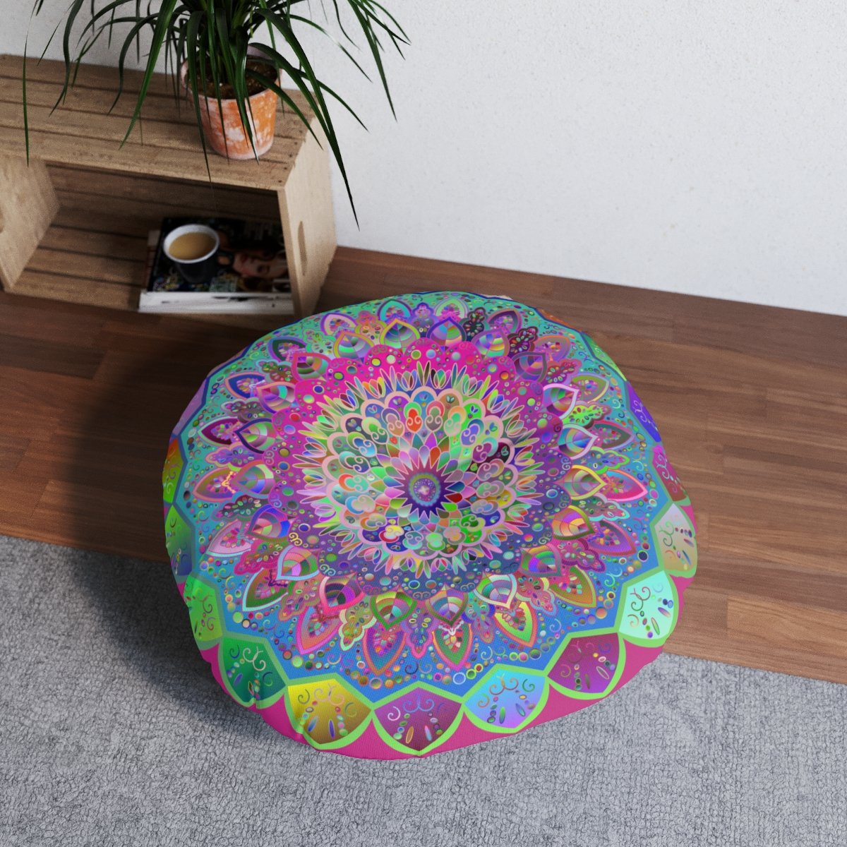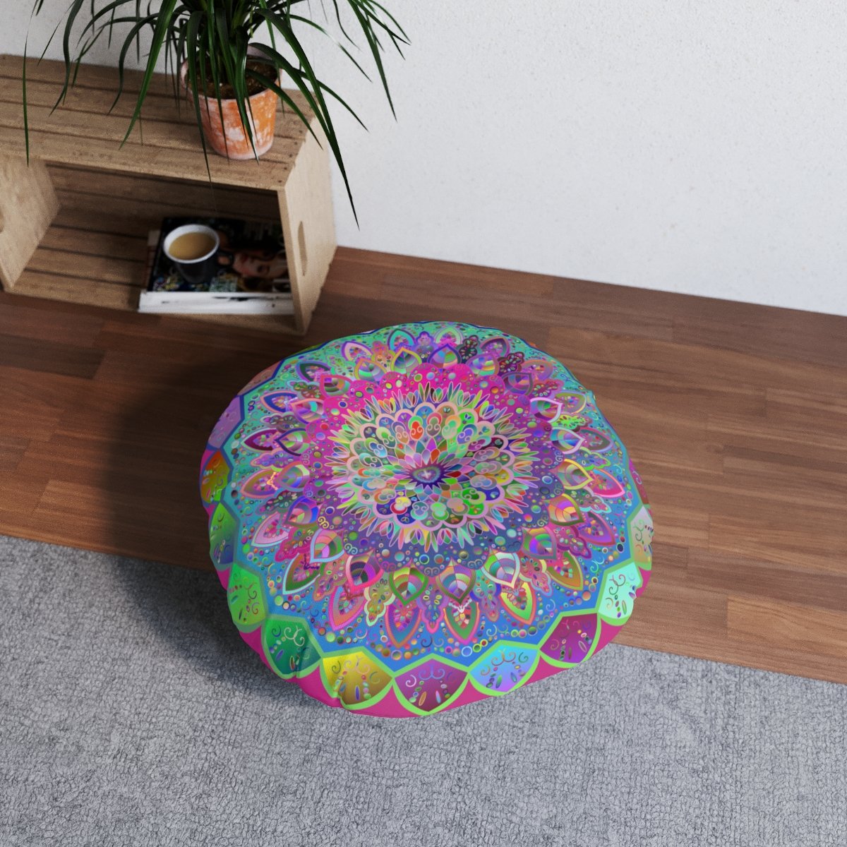 Floor Cushion Mandala Art Hand Drawn - Beautiful colorful Mandala on Fucsia background - Drawn by Hand - Tufted Floor Pillow, Round