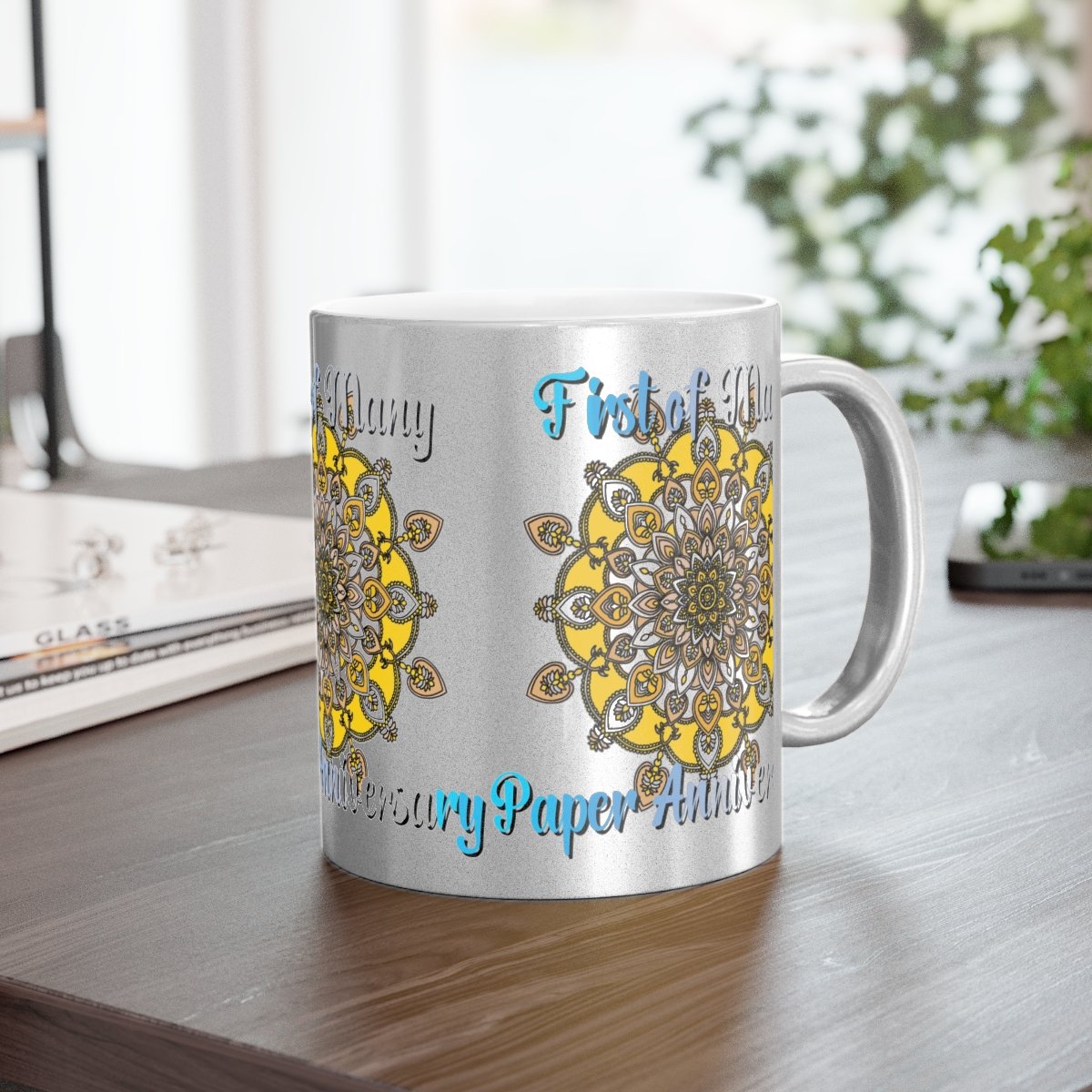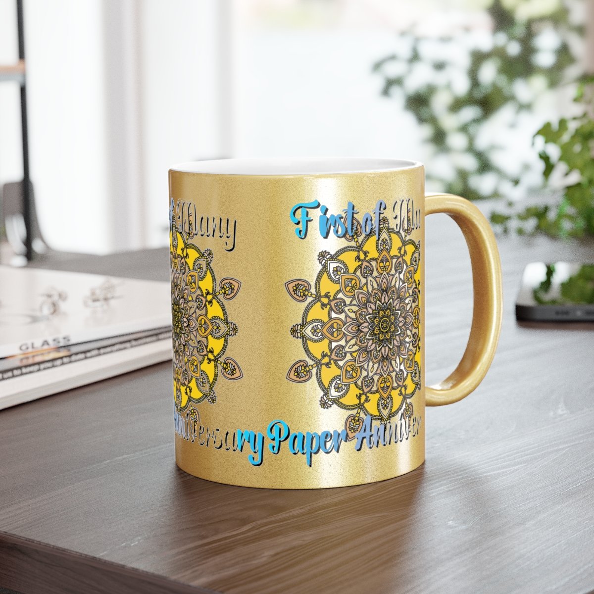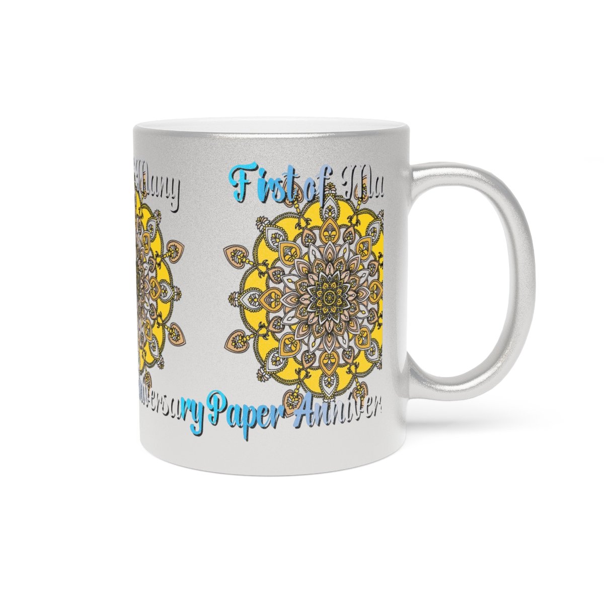 Celebrate your first year of marriage with the "First of Many, Paper Anniversary" Metallic Mug from Blululi. This 11oz ceramic mug, available in either a luxurious Gold or Silver coating, features a stunning hand-drawn mandala design in shades of gold and white, along with the touching phrase "1 Year Down, Forever to Go."