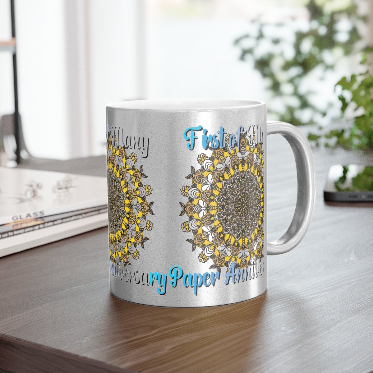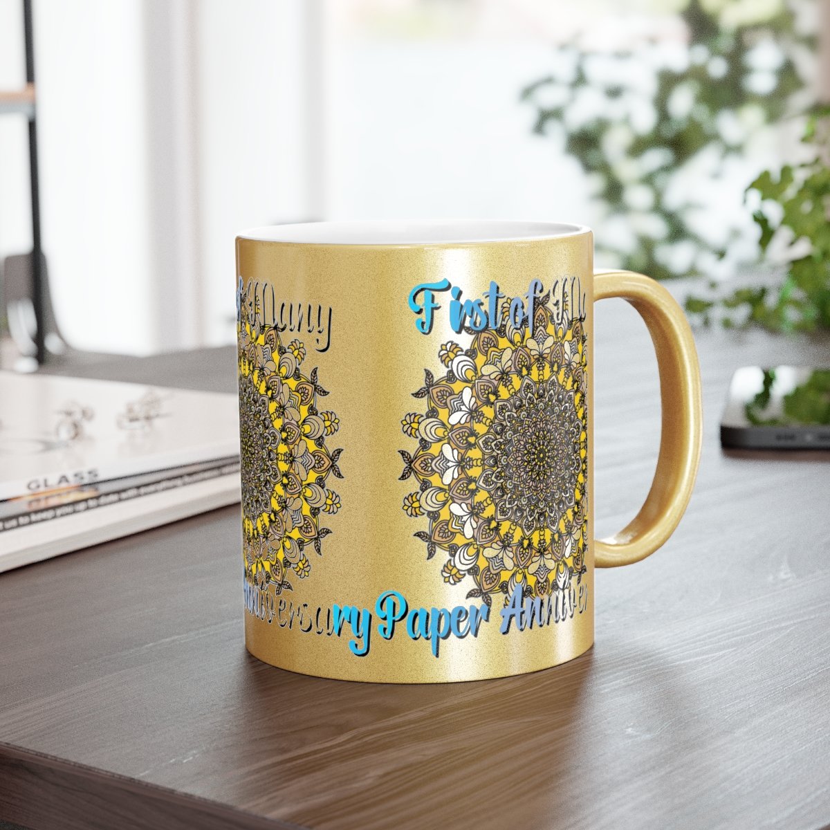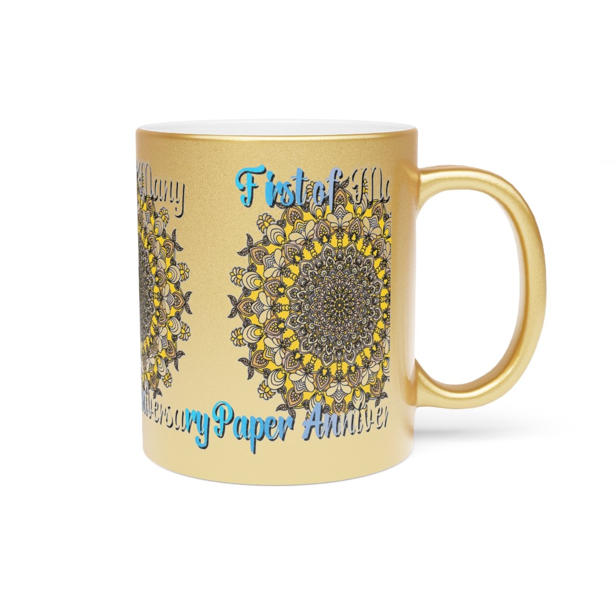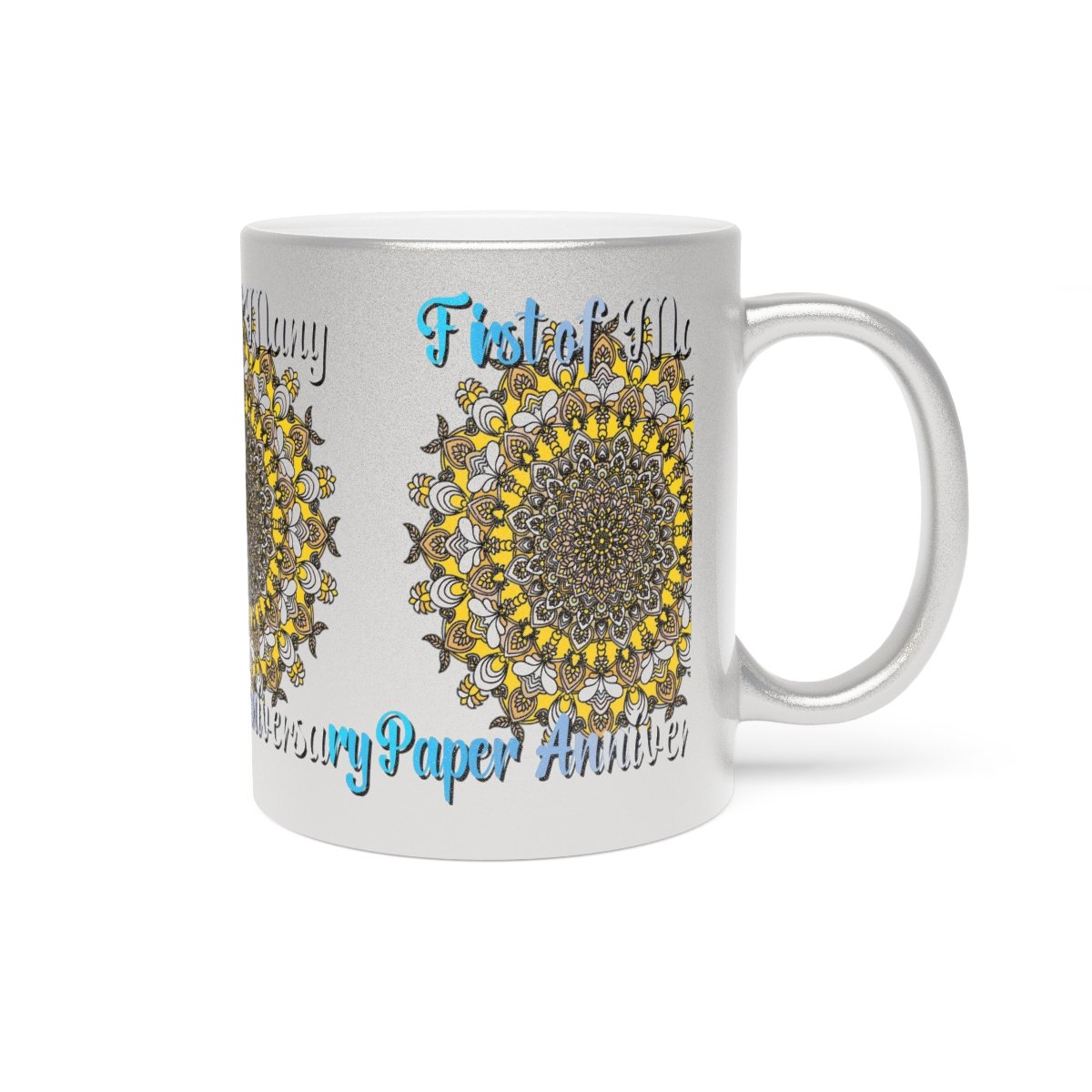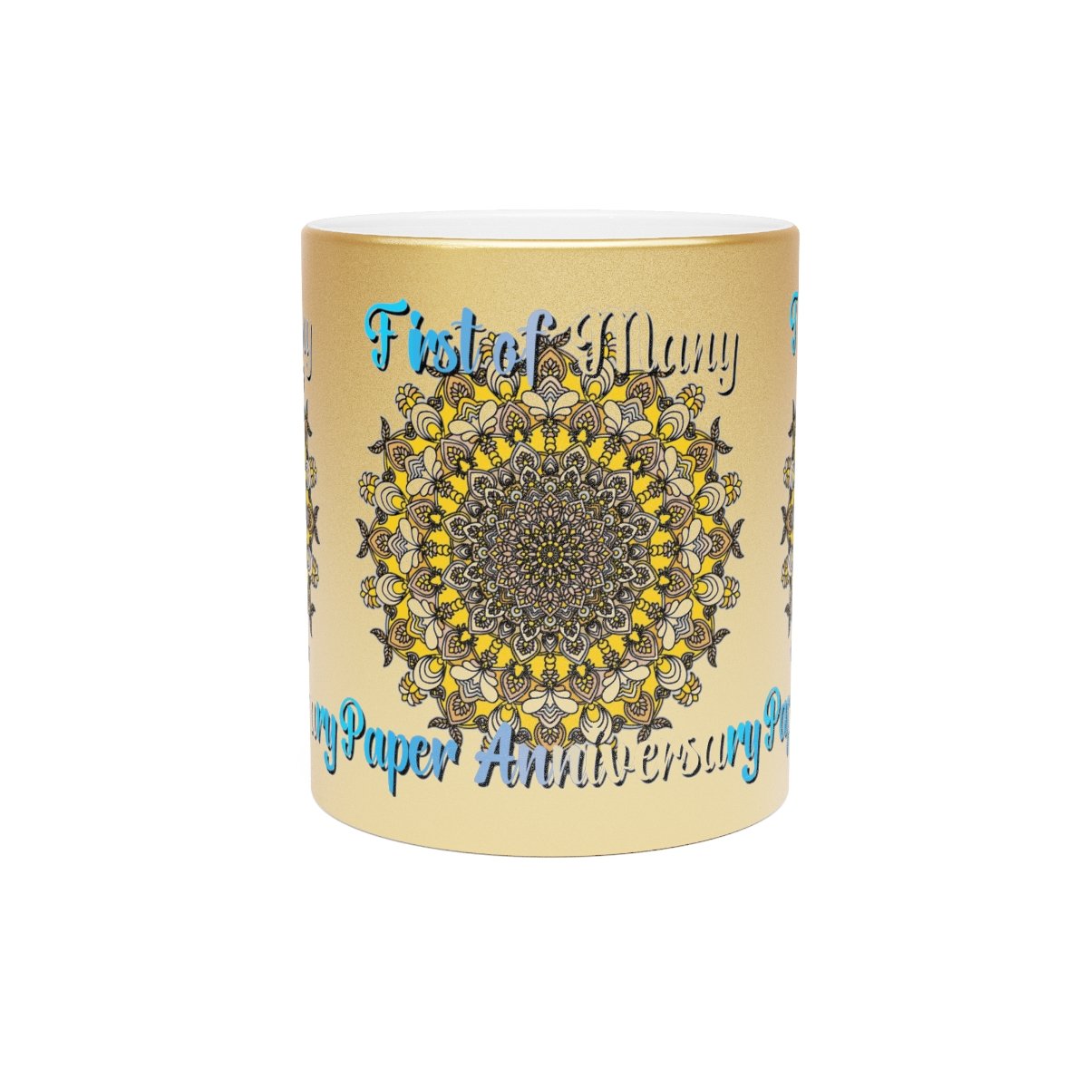 Celebrate your first year of marriage with the "First of Many, Paper Anniversary" Metallic Mug from Blululi. This 11oz ceramic mug, available in either a luxurious Gold or Silver coating, features a stunning hand-drawn mandala design in shades of gold and white, along with the touching phrase "1 Year Down, Forever to Go."