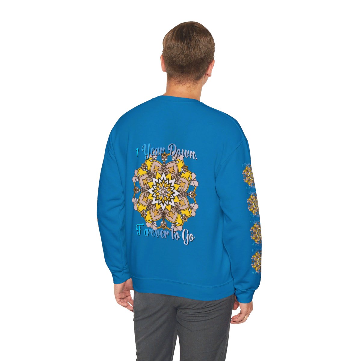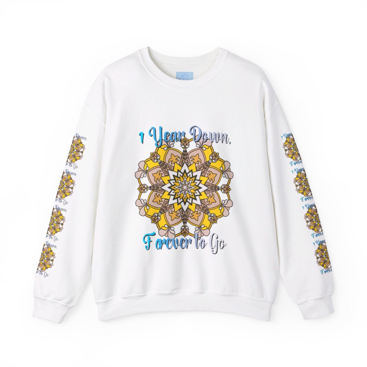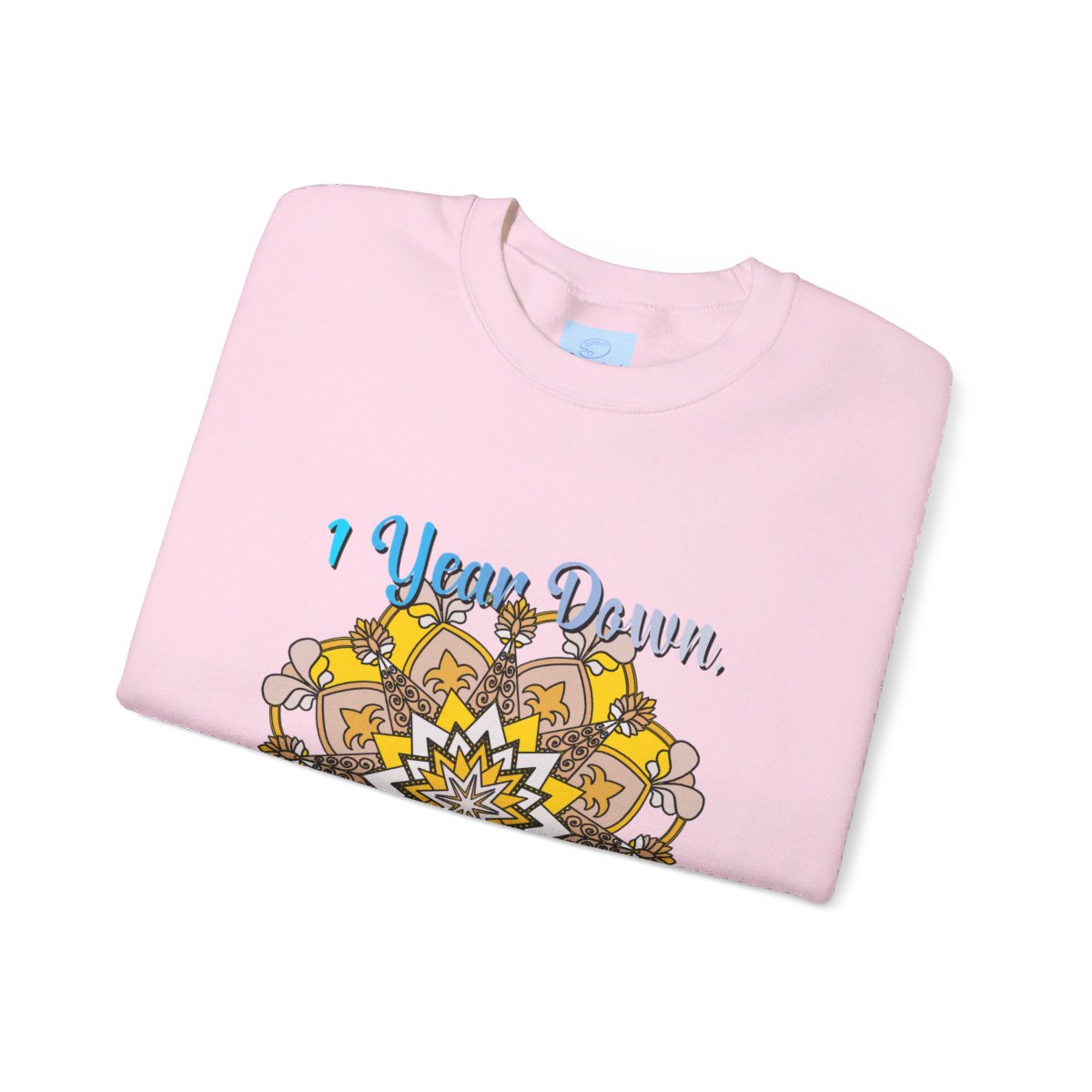 Celebrate your first year of marriage with the cozy and stylish "1 Year Down, Forever to Go" Unisex Heavy Blend™ Crewneck Sweatshirt from Blululi. Featuring a beautiful hand-drawn mandala design in shades of gold and white, this sweatshirt is the perfect way to mark your first wedding anniversary with warmth and love.