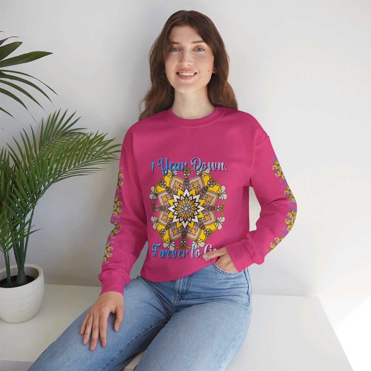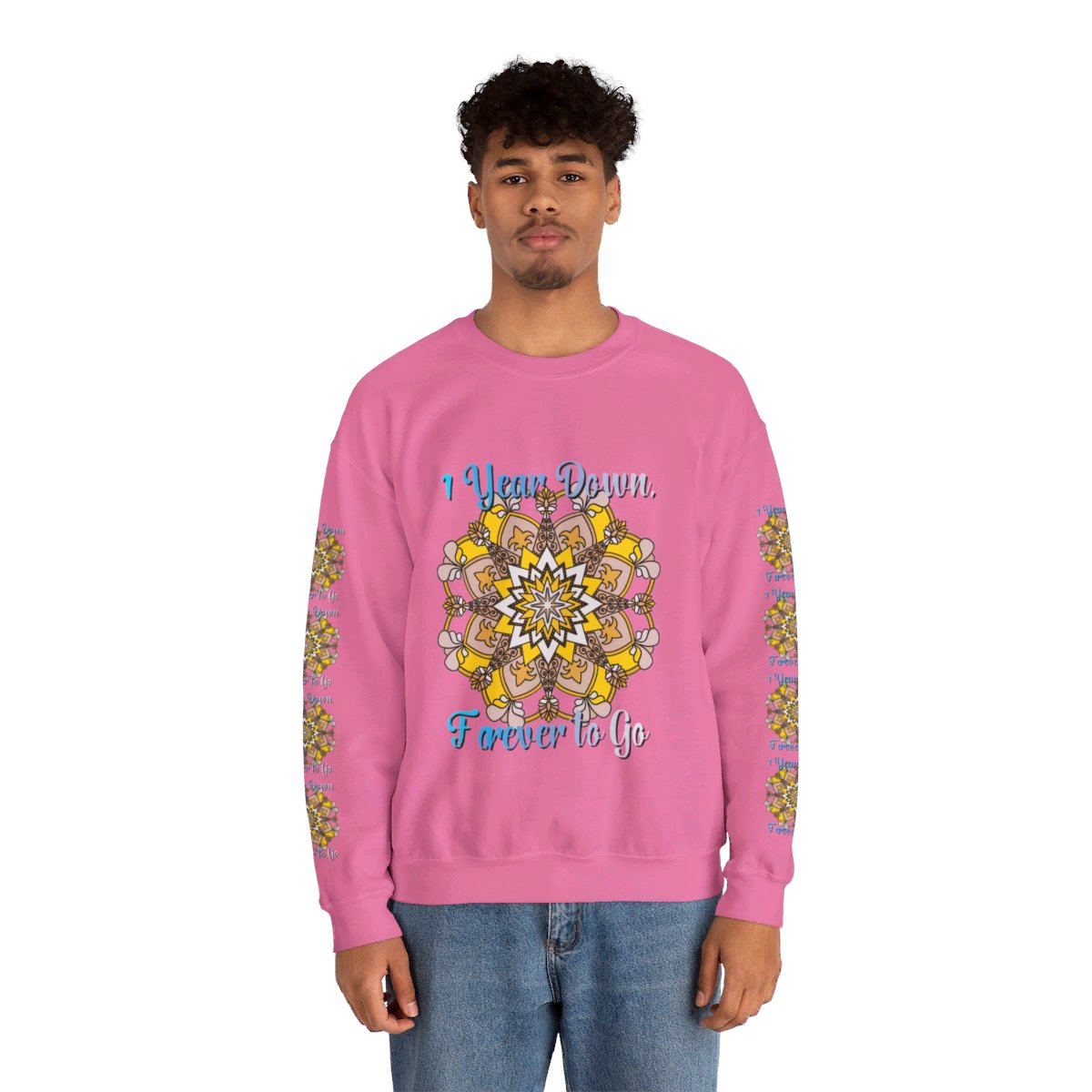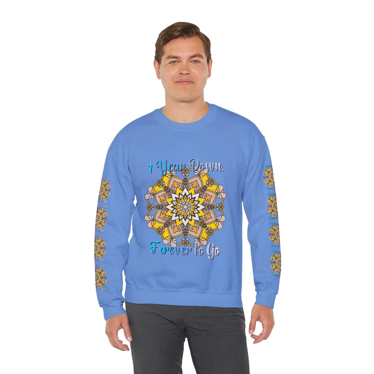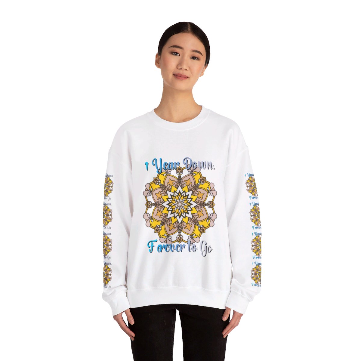 Celebrate your first year of marriage with the cozy and stylish "1 Year Down, Forever to Go" Unisex Heavy Blend™ Crewneck Sweatshirt from Blululi. Featuring a beautiful hand-drawn mandala design in shades of gold and white, this sweatshirt is the perfect way to mark your first wedding anniversary with warmth and love.