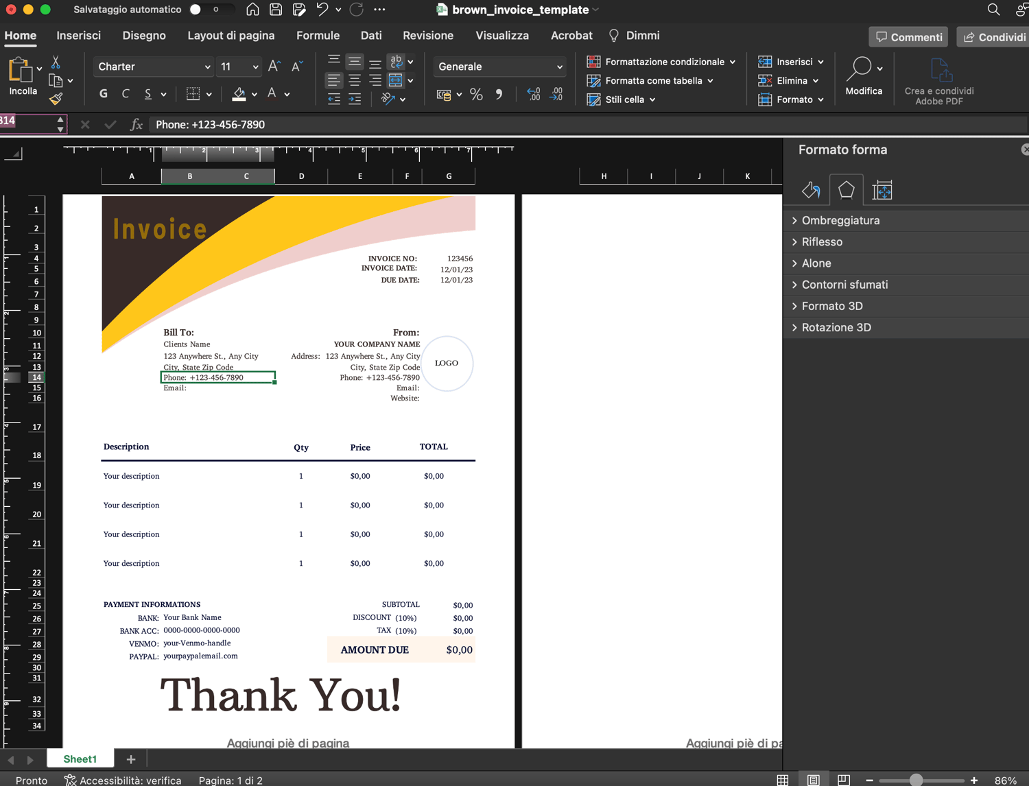 With user-friendly features, this template allows you to easily input your business details, itemize services or products, and calculate totals effortlessly, with automated Excel calculations for: Total, Subtotal, Discount, Tax, Amount Due. The clear layout ensures that your clients can quickly understand and process the information on the invoice.