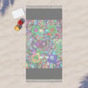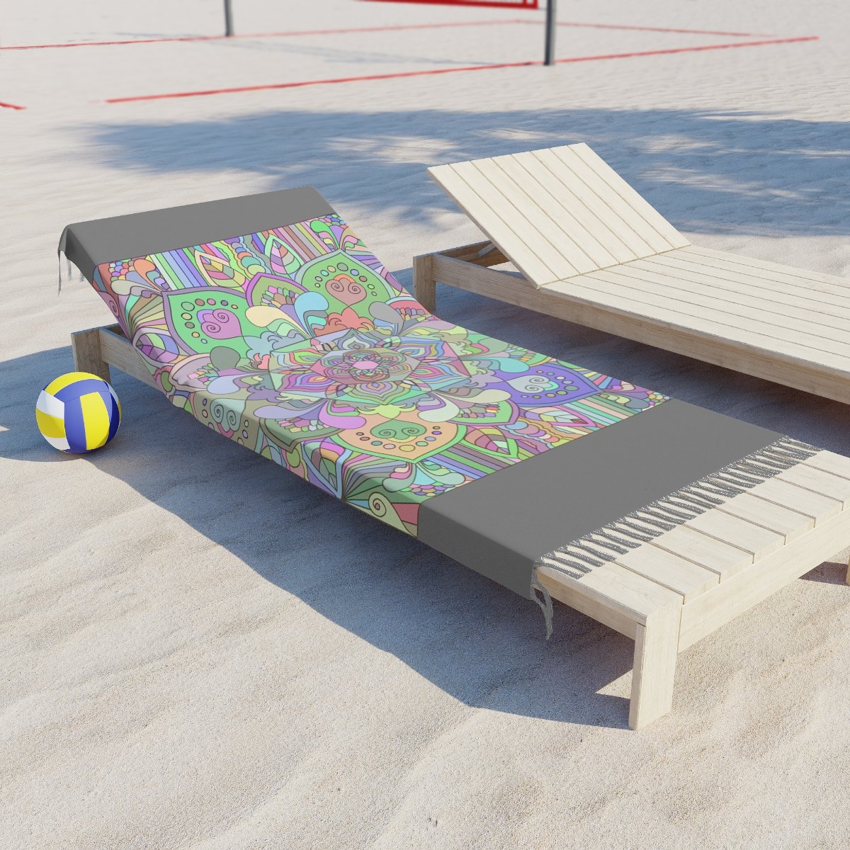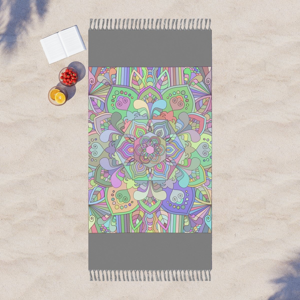 Boho Beach Cloth decorated with Mandala Art - Original Fine Art Hand-Drawn - Light Gray, Pastel Colors