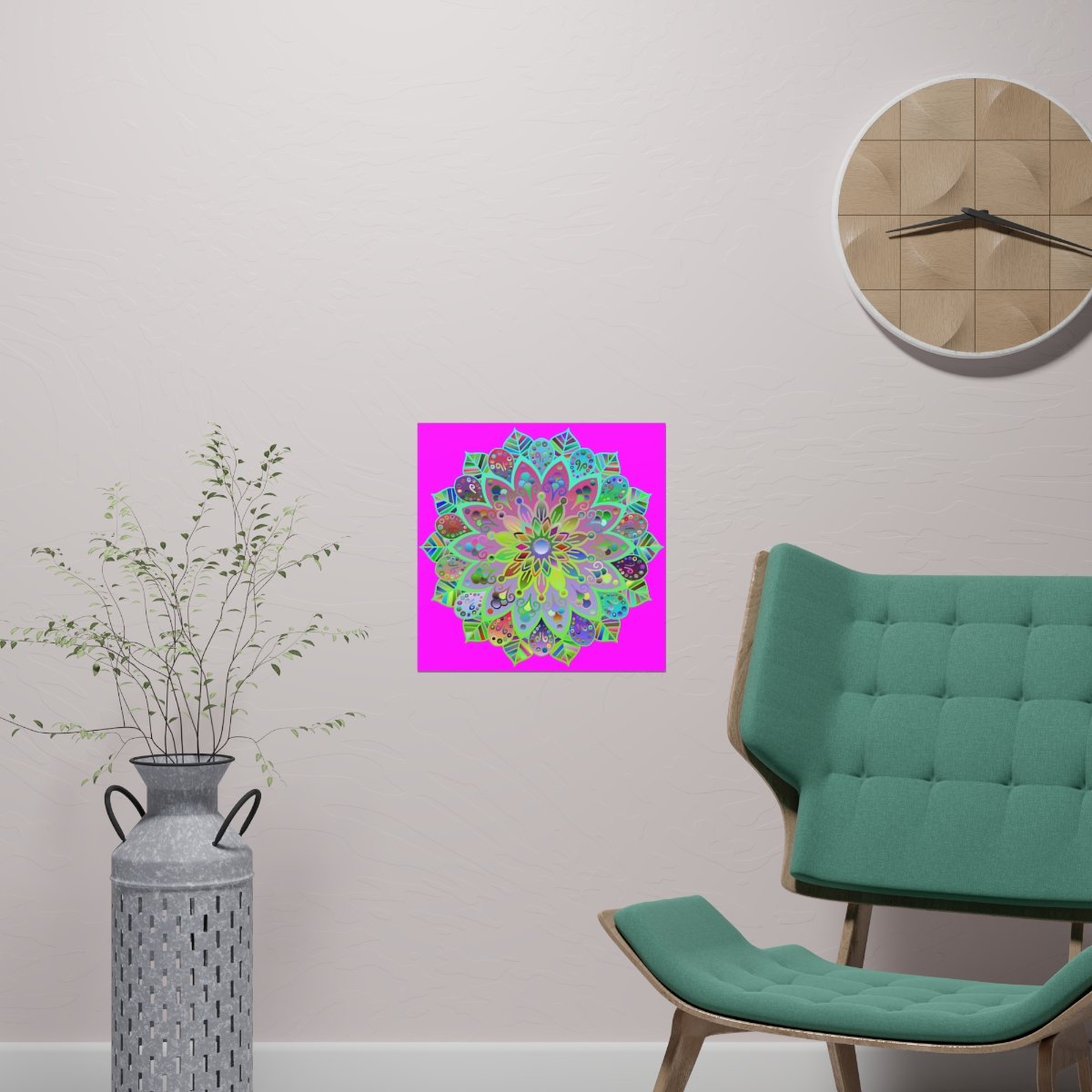 Square Matte Paper Poster Featuring Hand-Drawn Bright Mandala Art - Magenta