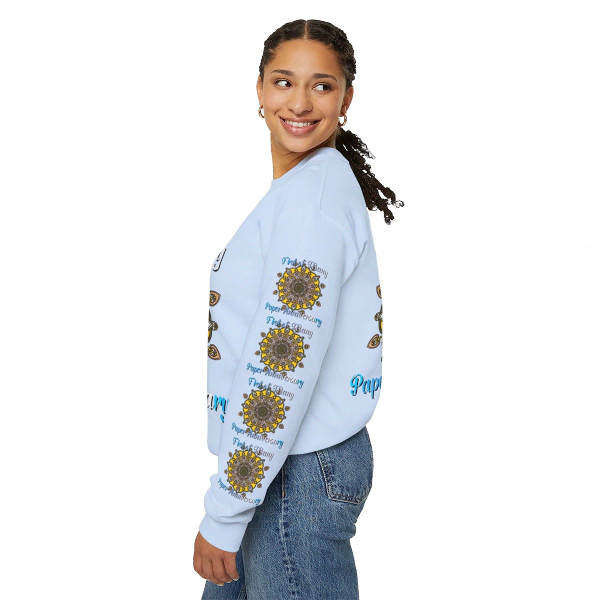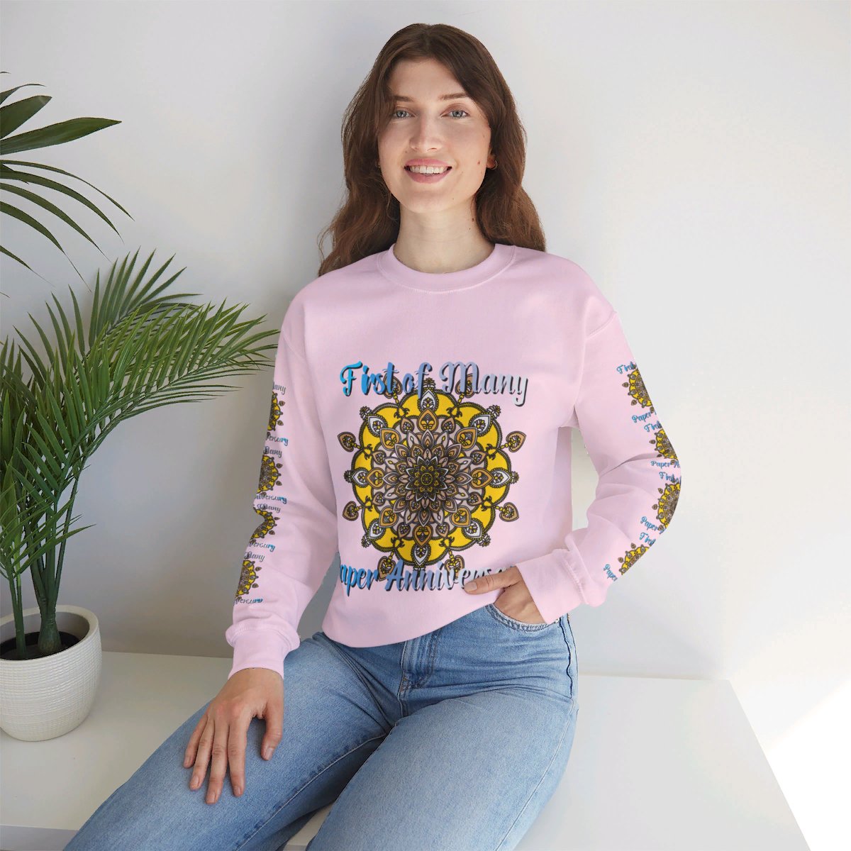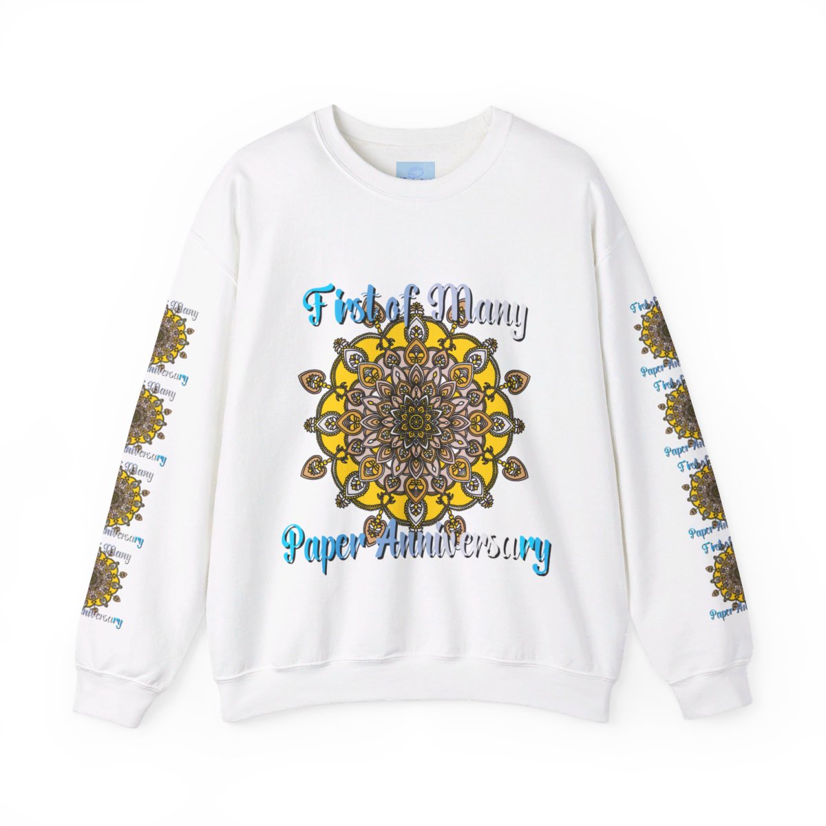 Celebrate your first year of marriage with the cozy and stylish "First of Many, Paper Anniversary" Unisex Heavy Blend™ Crewneck Sweatshirt from Blululi. Featuring a beautiful hand-drawn mandala design in shades of gold and white, this sweatshirt is the perfect way to mark your first wedding anniversary with warmth and love.