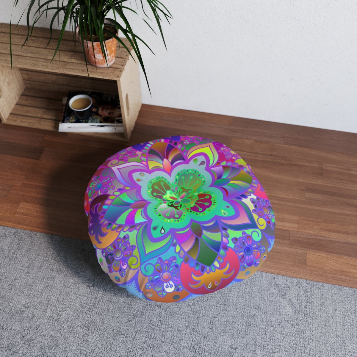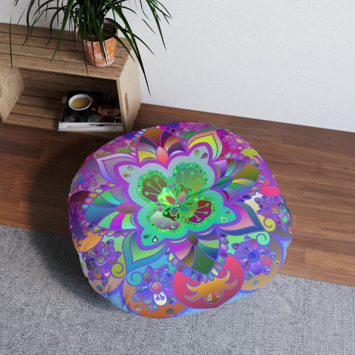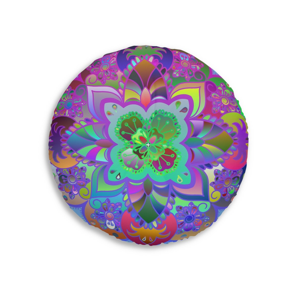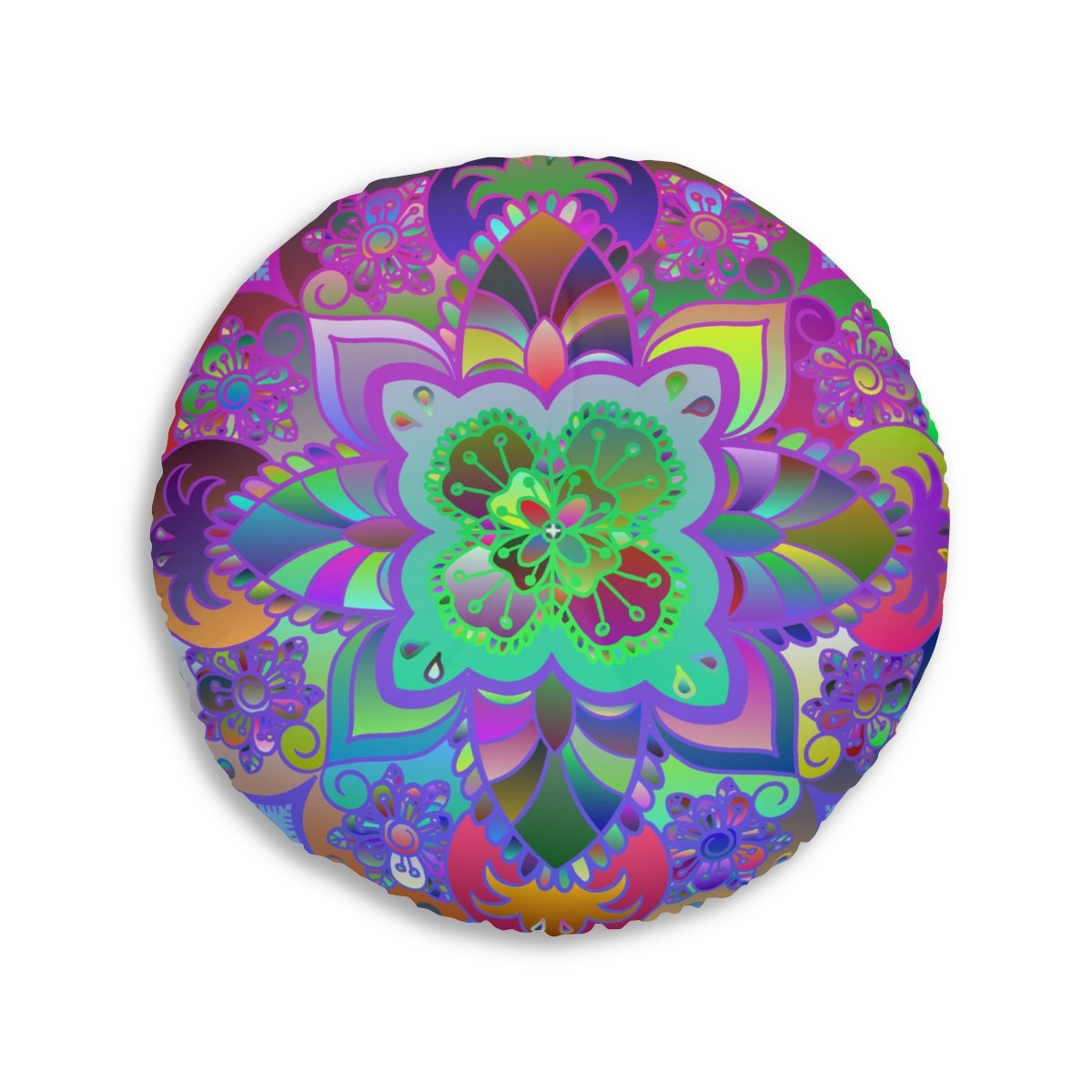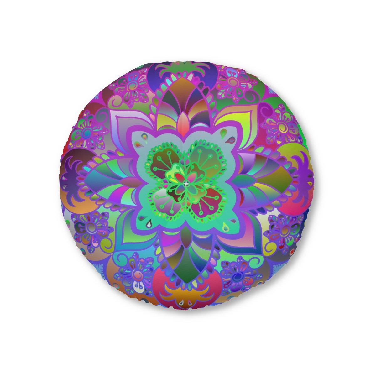 Add a mandala art touch to any resting area around the house with a Mandala Art round tufted floor pillow, which has a Beatiful colorful mandala Drawn by Hand in the middle on a Light Blue background . Shipped with its own filling, this floor pillow is as comfy as it is stylish. Bring your resting areas to life by adding a touch of stylish artwork handmade and catchy colors.
