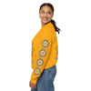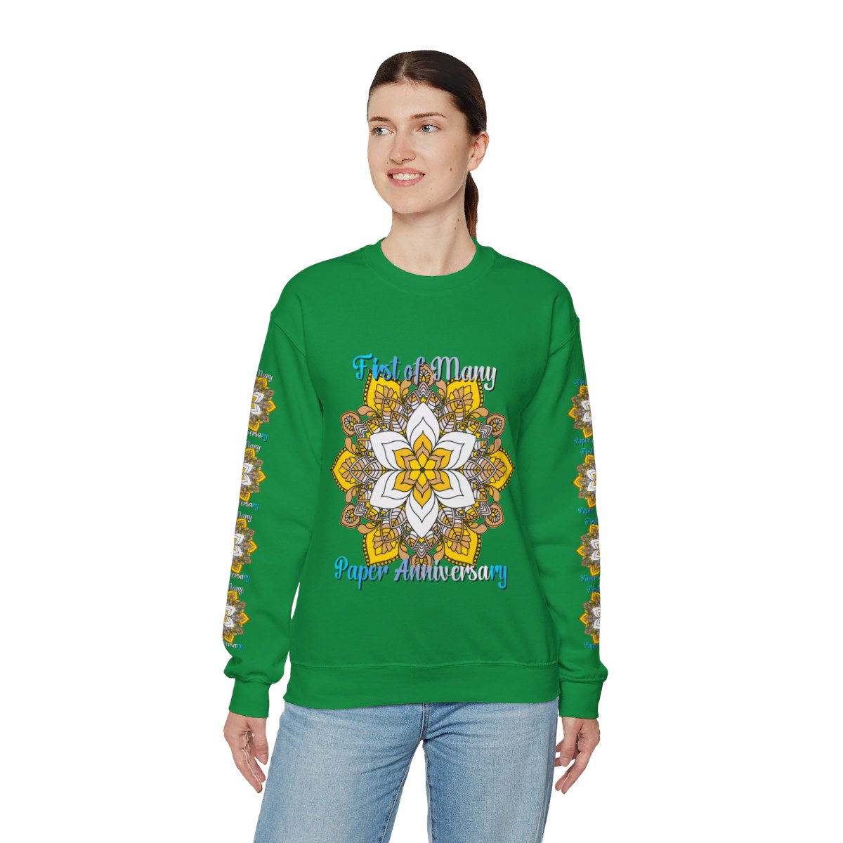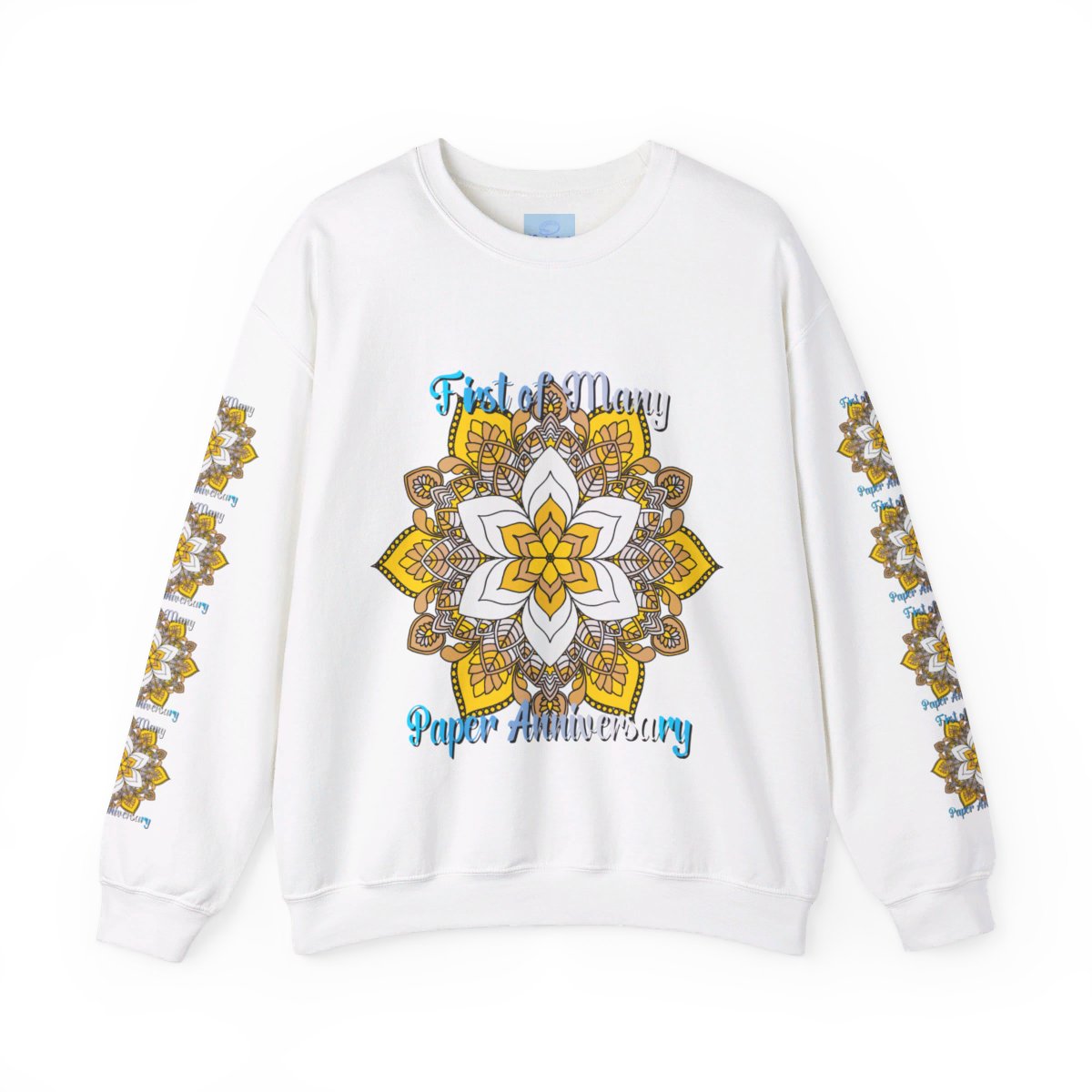 Celebrate your first year of marriage with the cozy and stylish "First of Many, Paper Anniversary" Unisex Heavy Blend™ Crewneck Sweatshirt from Blululi. Featuring a beautiful hand-drawn mandala design in shades of gold and white, this sweatshirt is the perfect way to mark your first wedding anniversary with warmth and love.