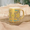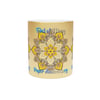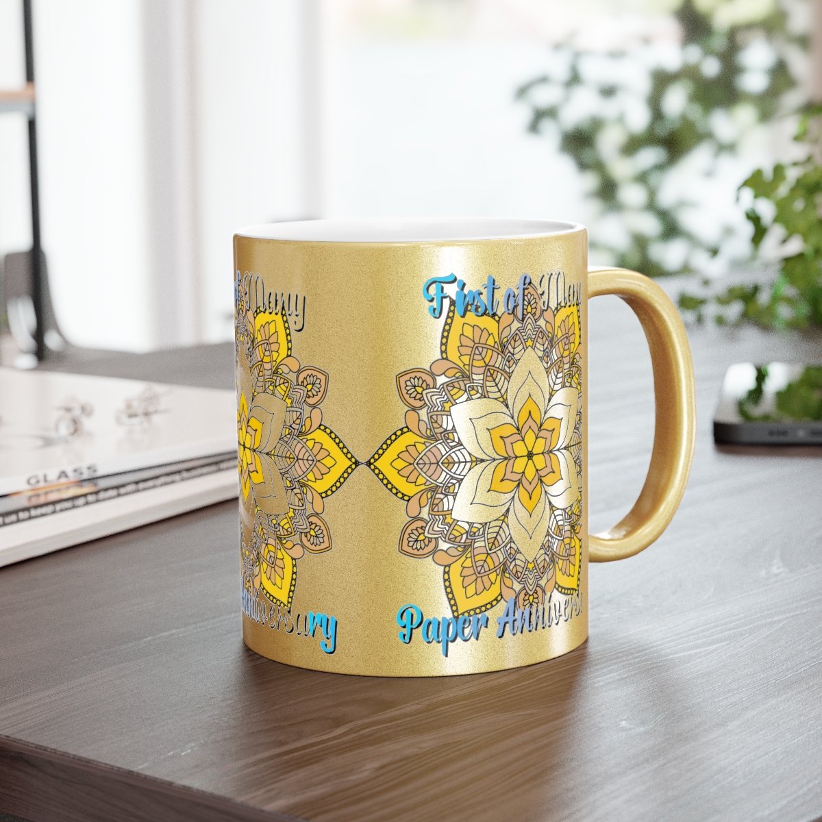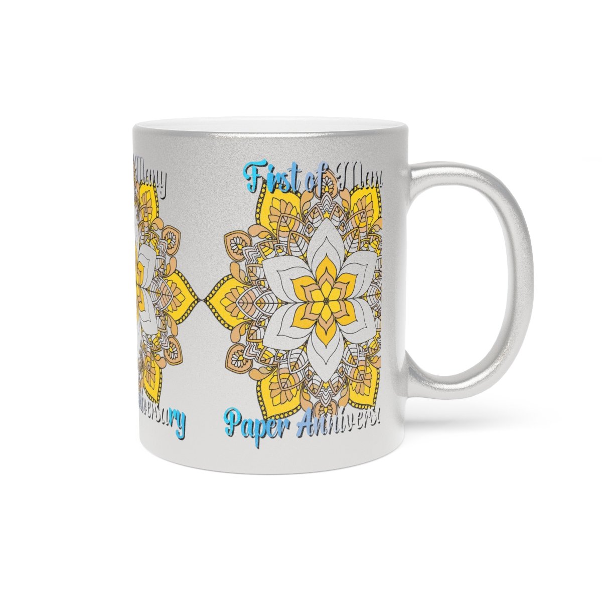 Celebrate your first year of marriage with the "First of Many, Paper Anniversary" Metallic Mug from Blululi. This 11oz ceramic mug, available in either a luxurious Gold or Silver coating, features a stunning hand-drawn mandala design in shades of gold and white, along with the touching phrase "1 Year Down, Forever to Go."