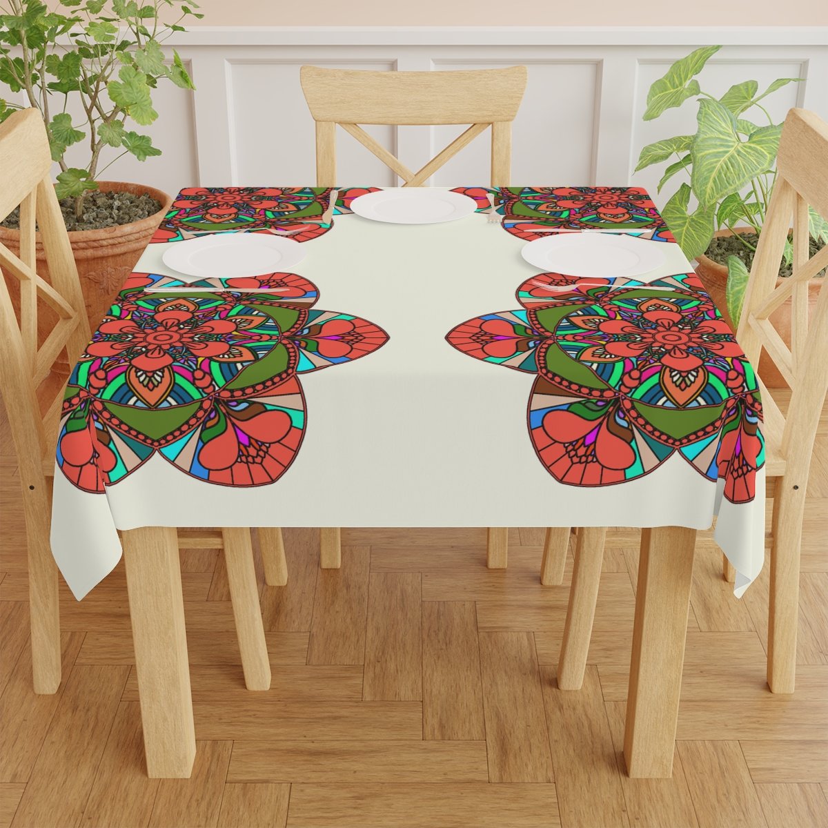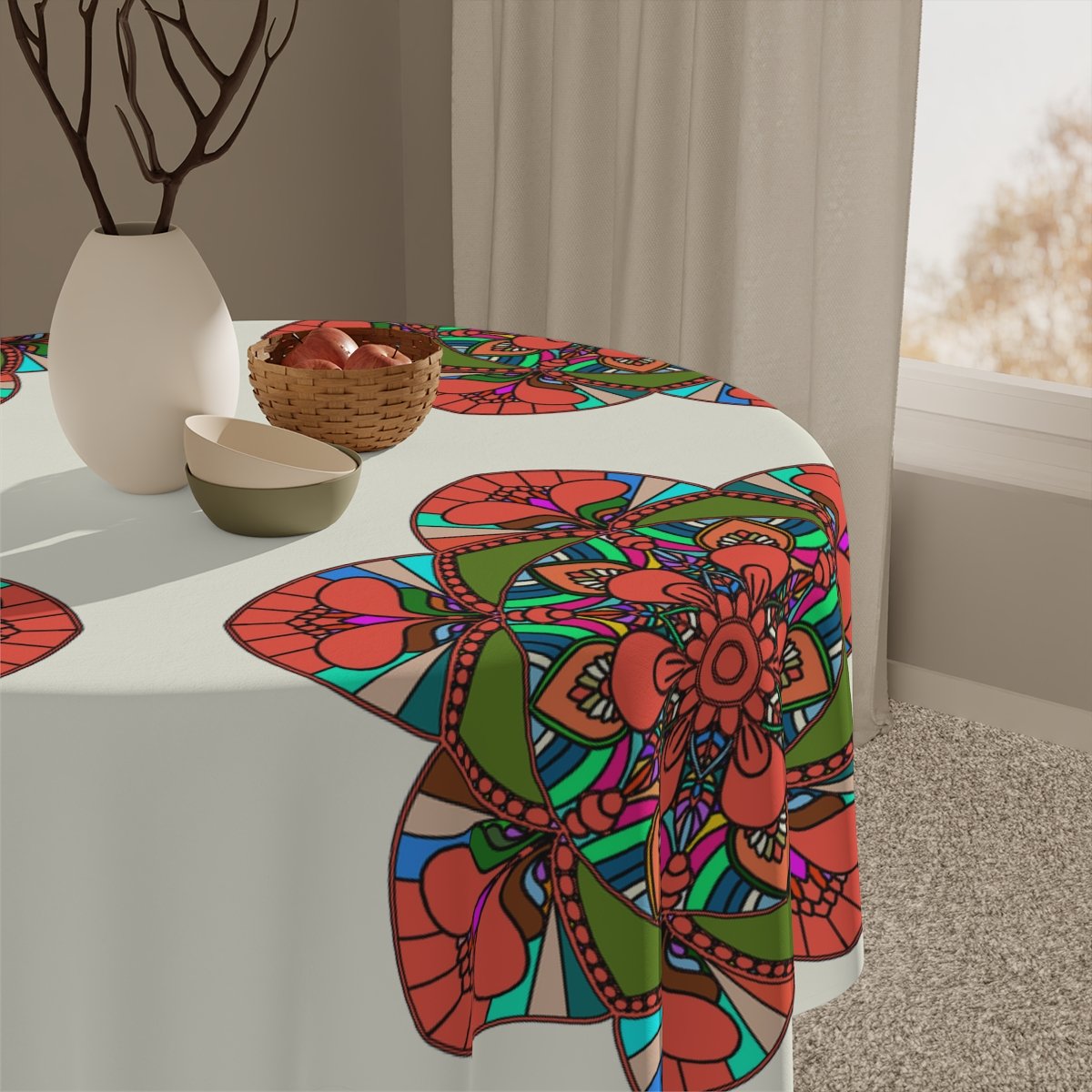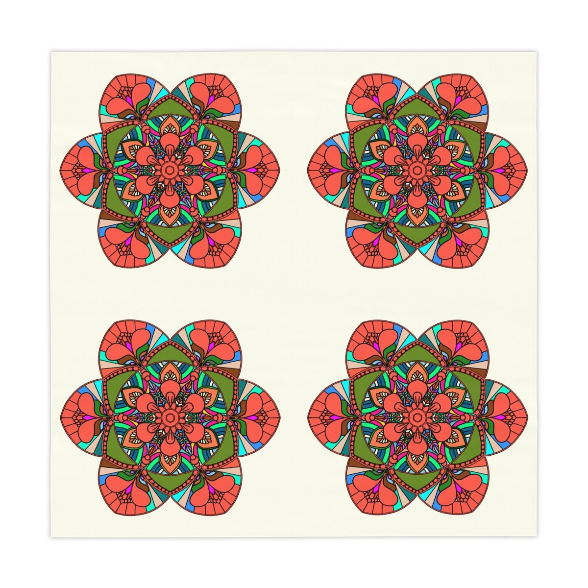 Uplift any home's aesthetics with this personalized tablecloth. Each Mandala Art is Drawn by Hand. Measuring in at 55.1" by 55.1", this personalized table cloth is a full-print product. What's more, the 100% polyester fabric construction makes it effortless to maintain like new.